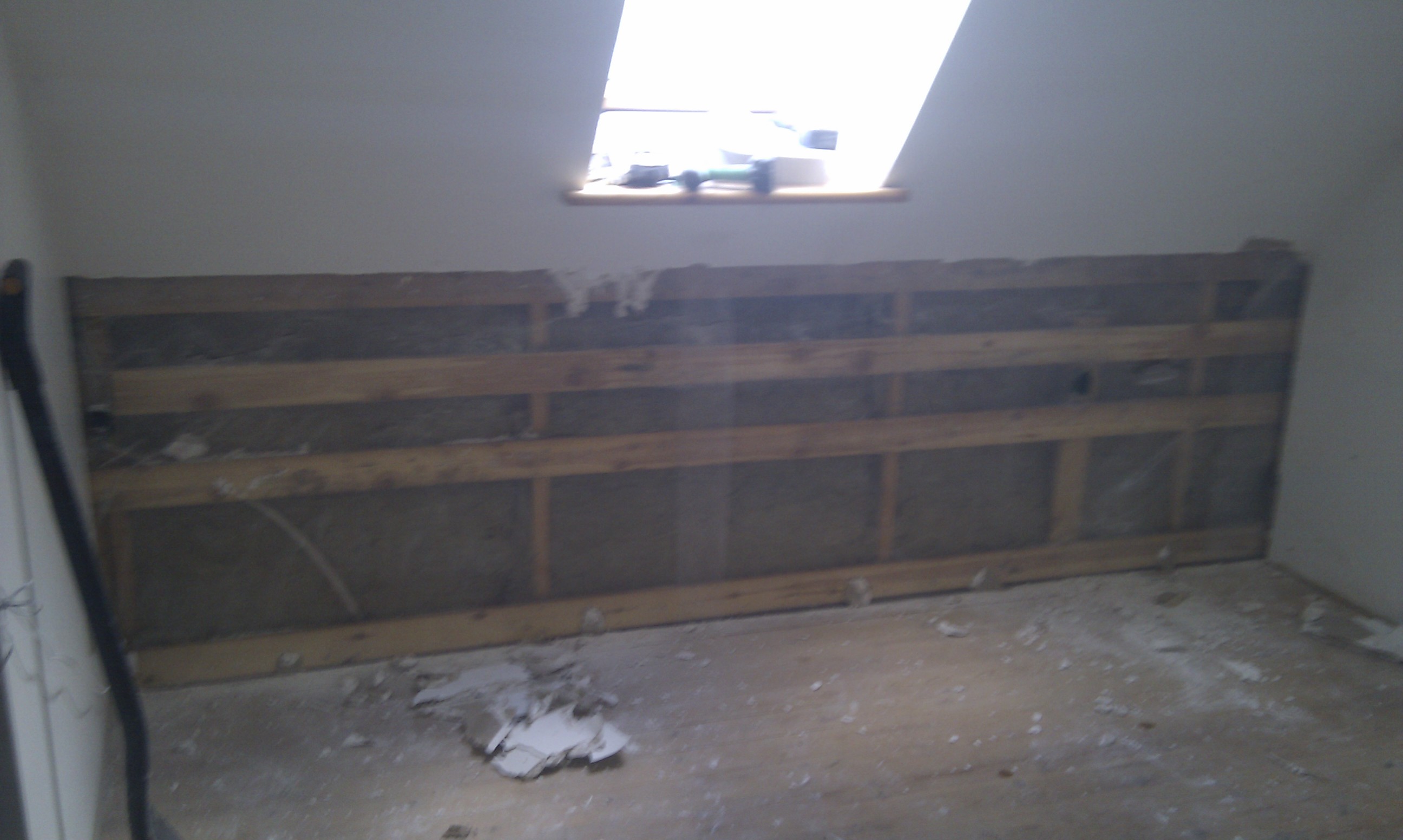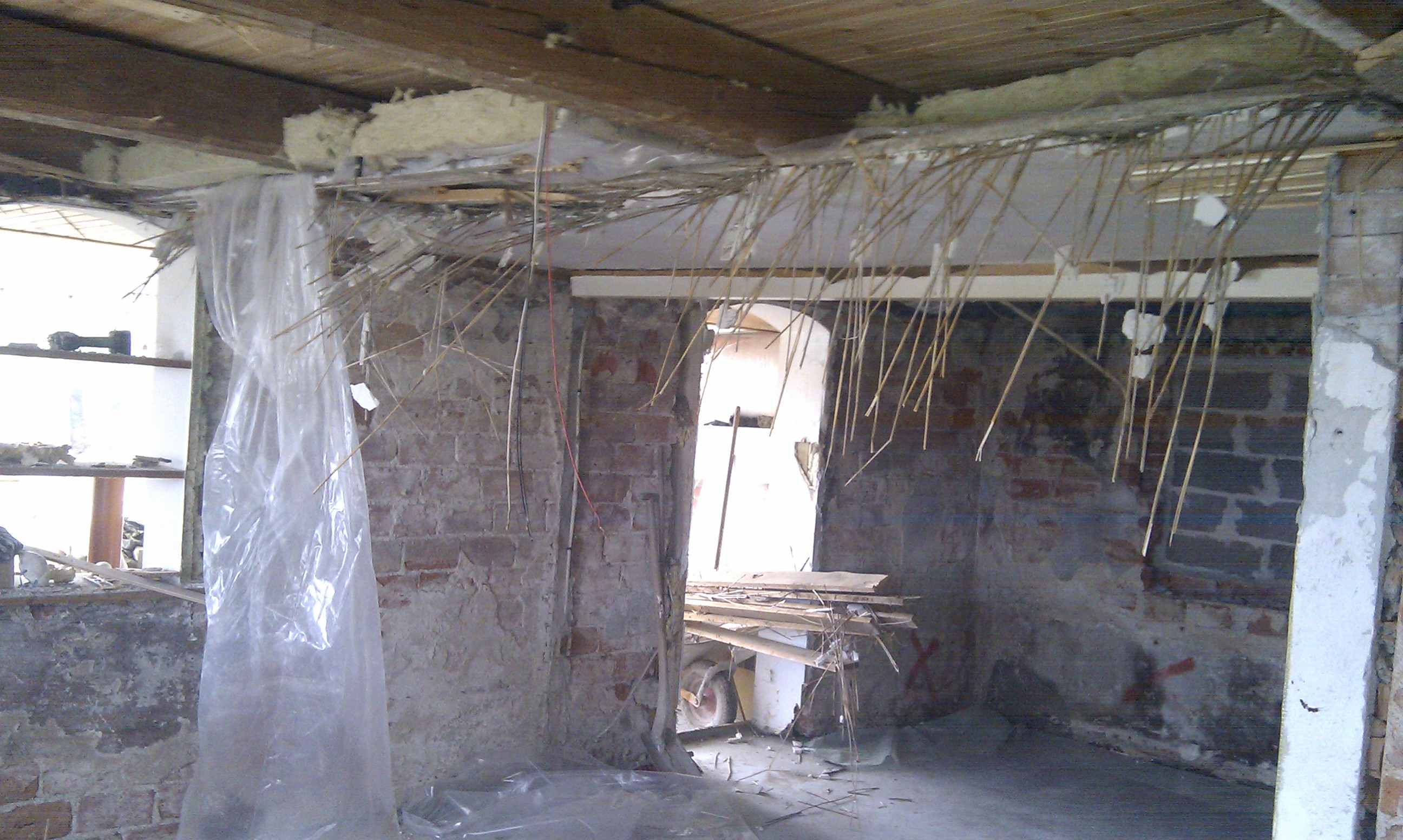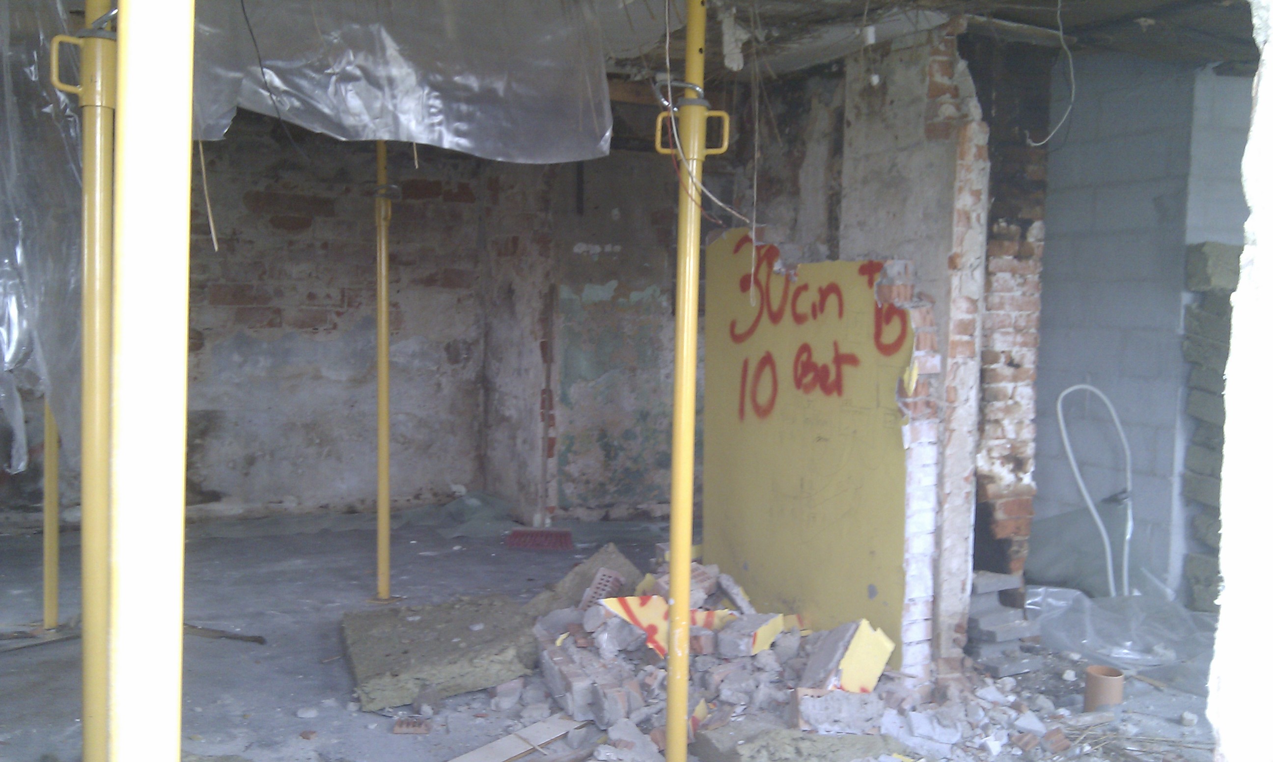 – har det været nødvendigt at gå igang med at fjerne den del af skorstenen der var syg – hvilket naturligvis var den nederste del i stue etagen.