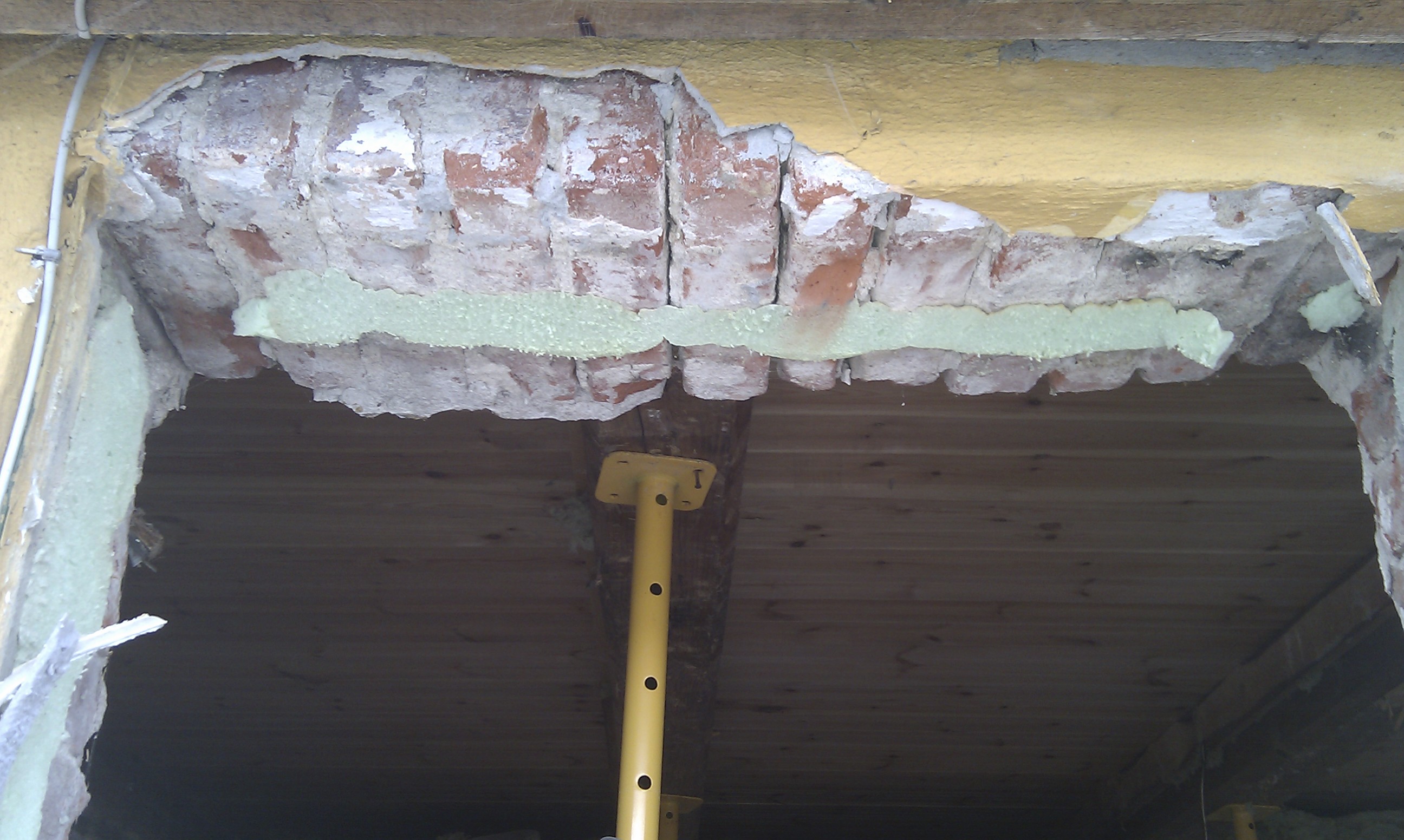 Slog et større hul gennem skorstenen i toppen, og lagde denne stålbjælke igennem hullet. Dernæst satte han to 4″ x 4″ bjælker under stålstangen så denne var totalt understøttet op under bjælken.
