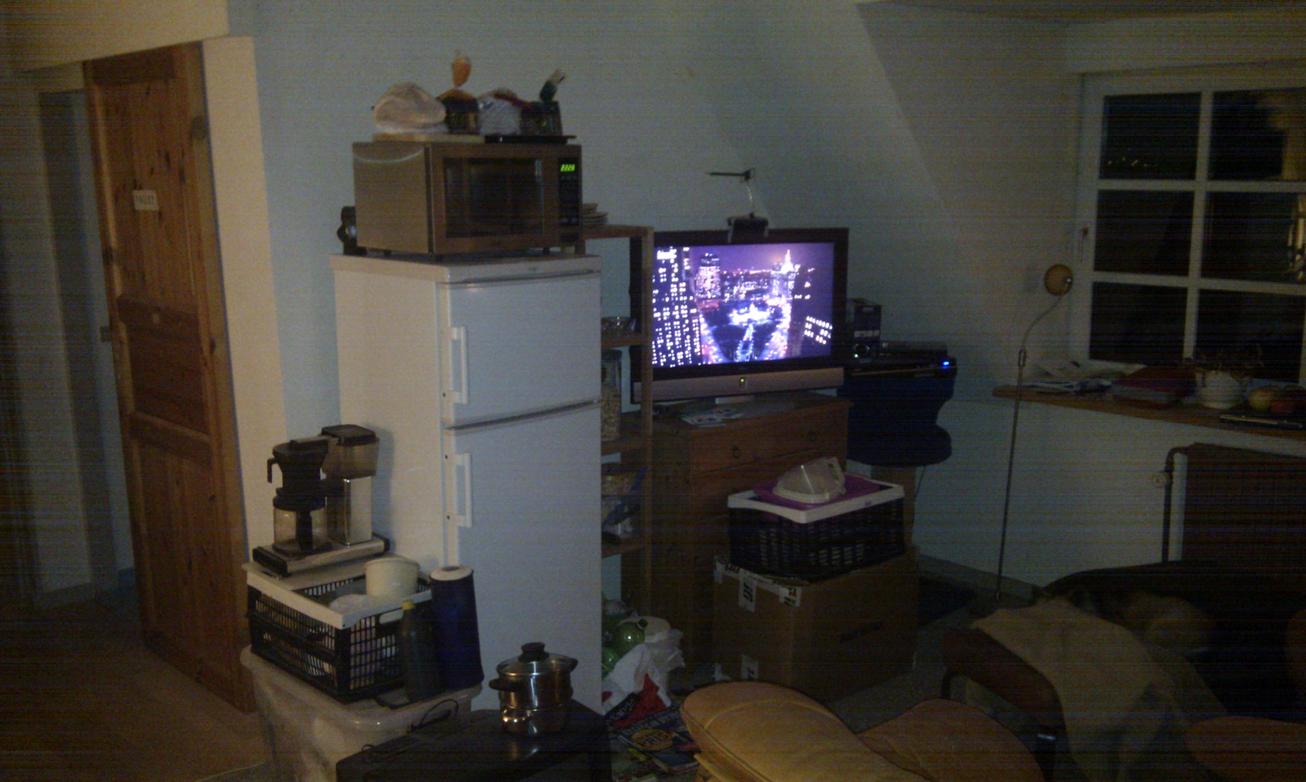 På førstesalen har vi et soveværelse, stue, badeværelse og køleskabet til at stå, samt kontoret midlertidigt monteret i stuen. Det fungerer meget godt – omend det da bliver dejligt at have et ordentligt køkken, med opvaskemaskine, ovn, vask og lignende – da det er lidt træls at stå i badeværelset på førstesalen og vaske op i toiletvasken.