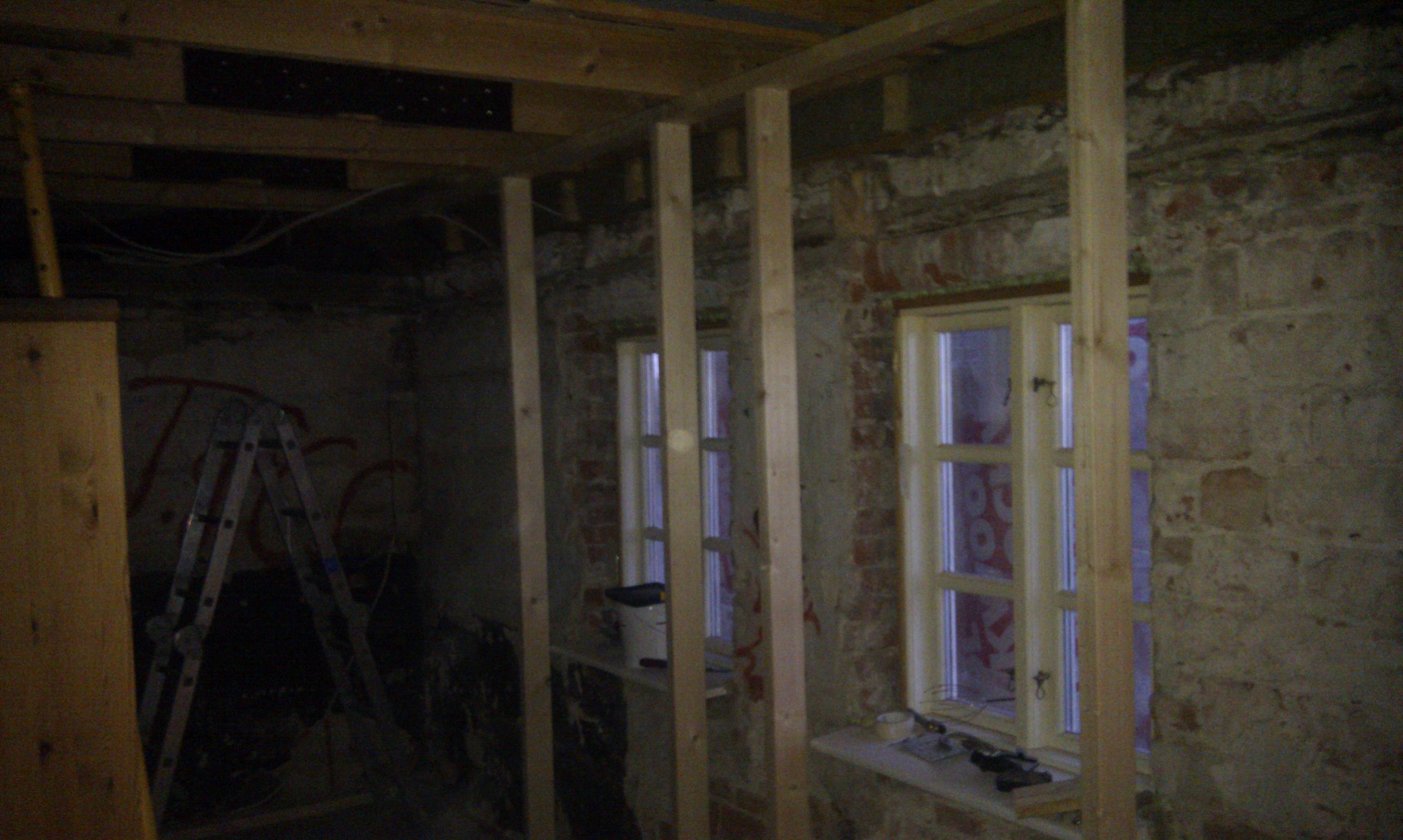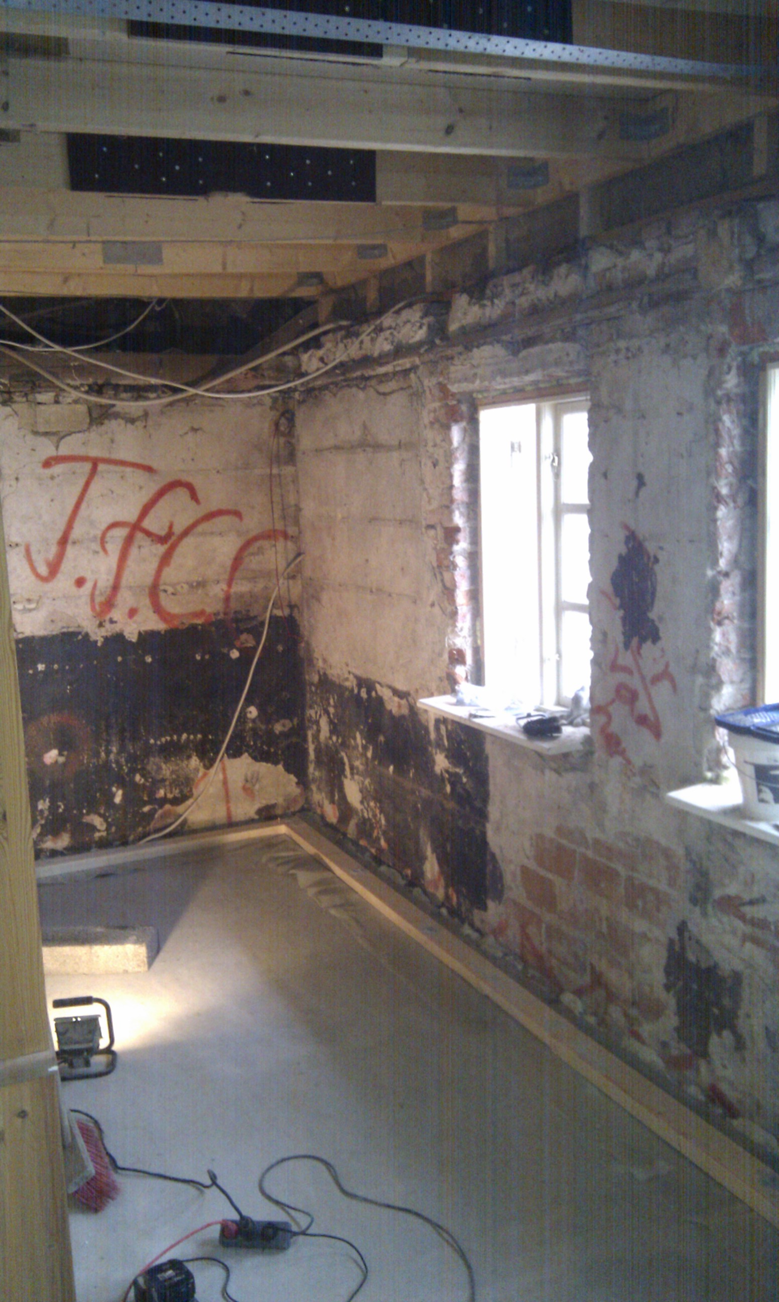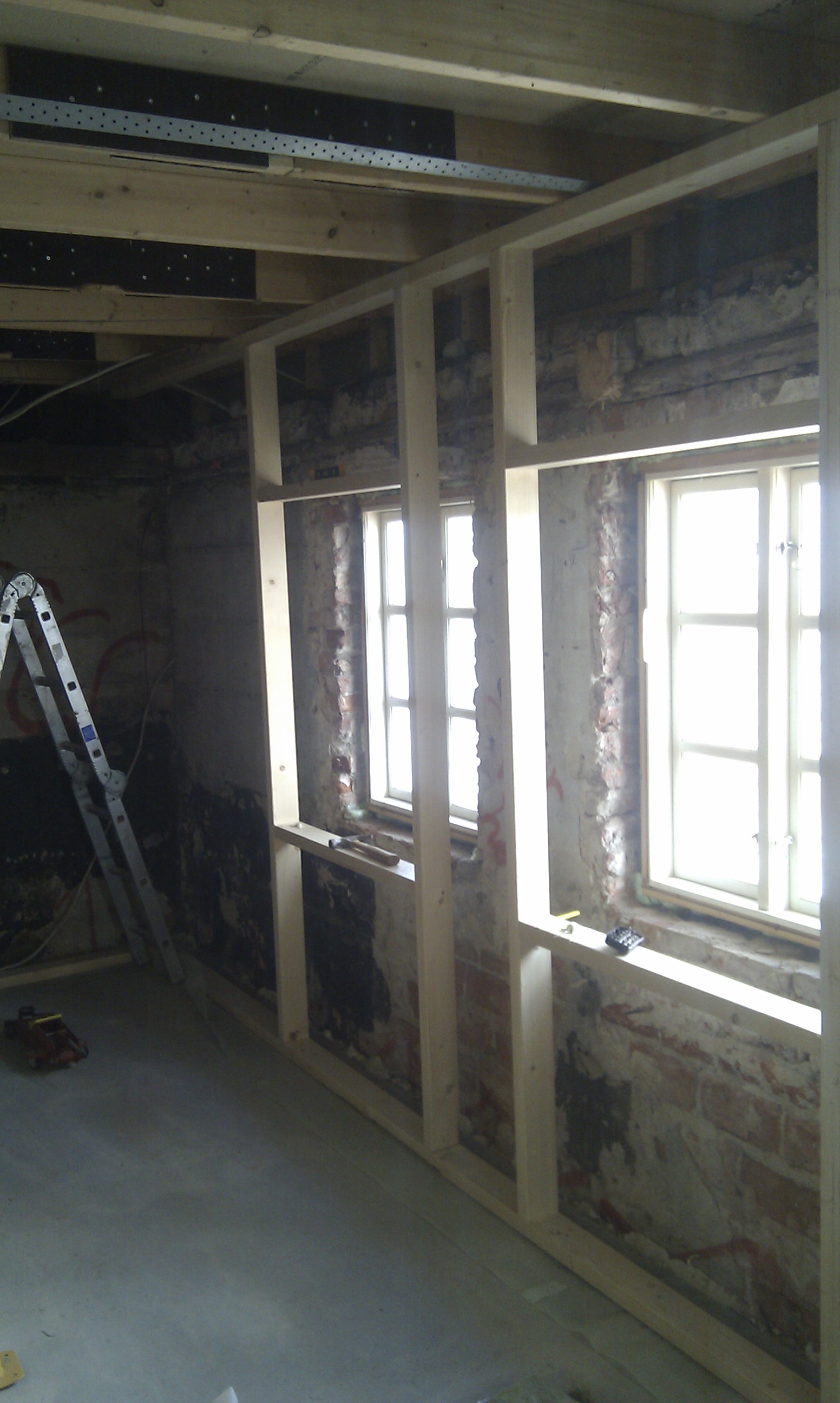 Alle reglar er bevidst lavet et par mm for lange, hvorved vi sikrer at væggen vil blive aflastet en smule, og det vil være sundt for en væg der er langt over 100 år gammel.