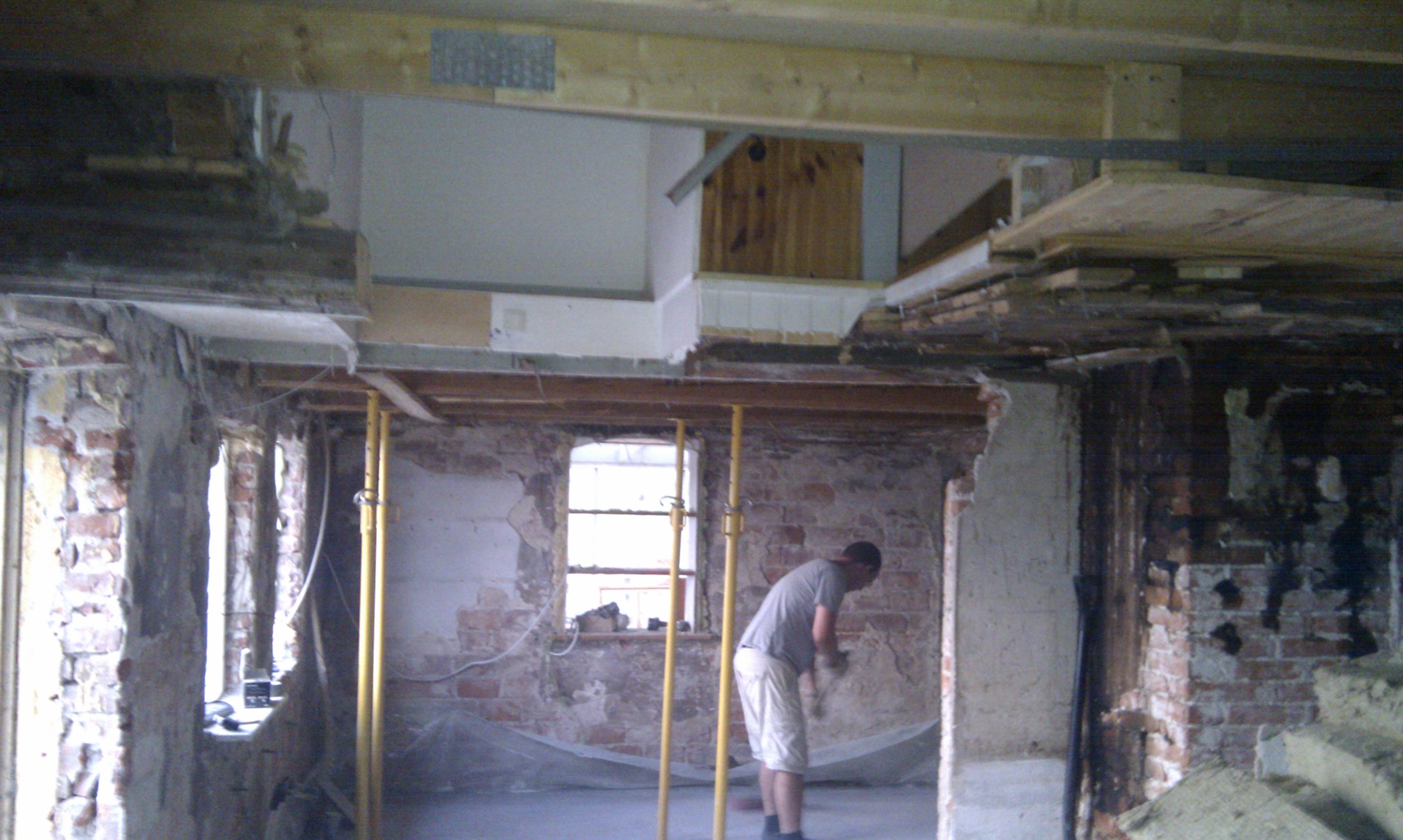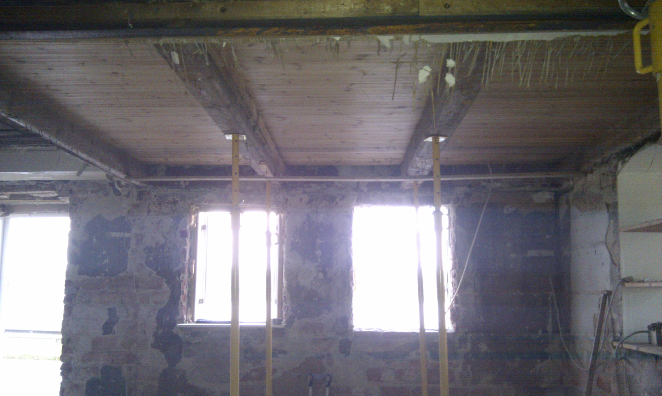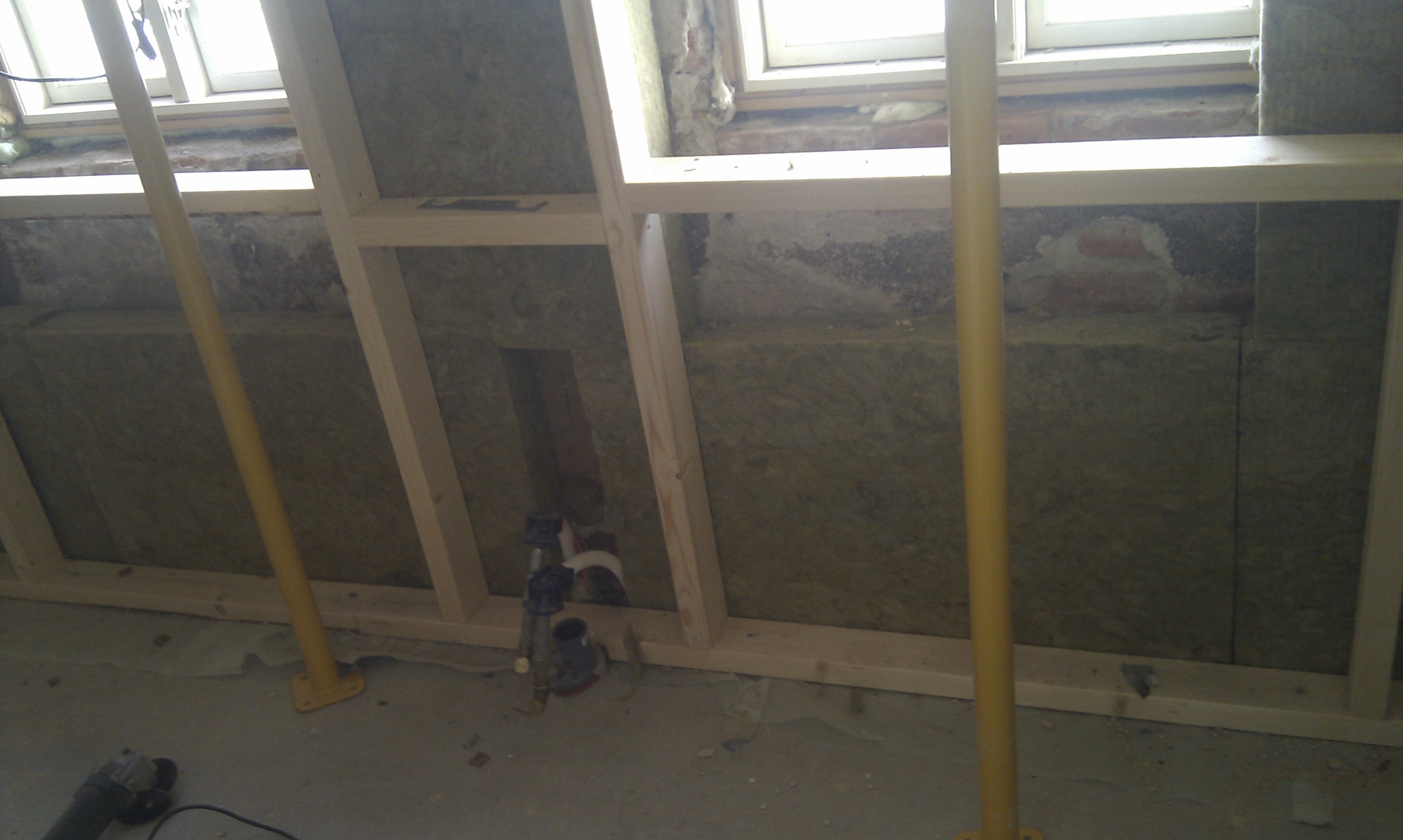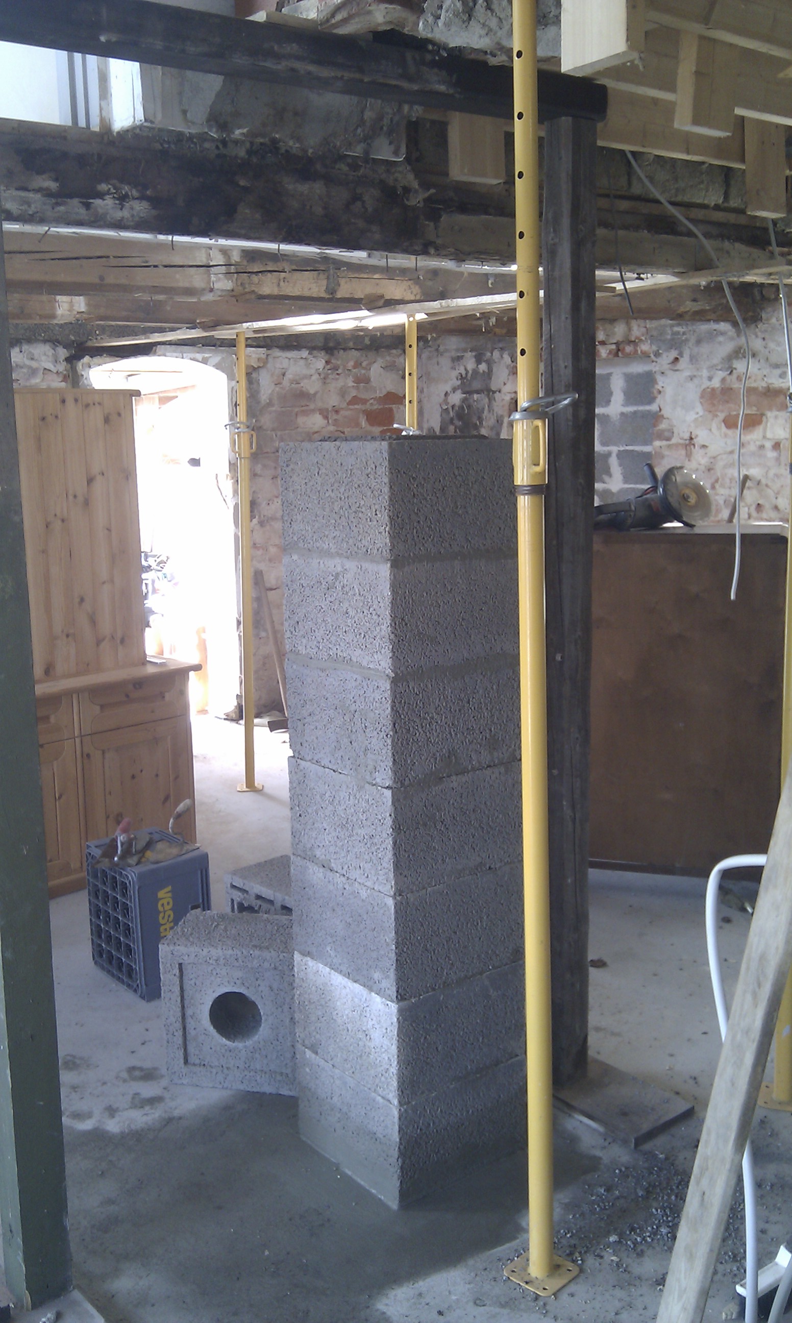 På billedet til højre kan man se markeringen med isolertape hvor vi havde besluttet at ovnen skulle være – og den gamle brændeovn.