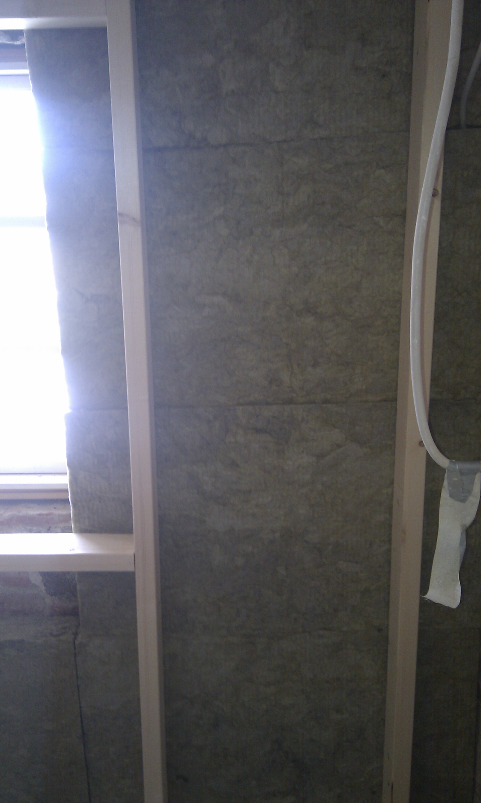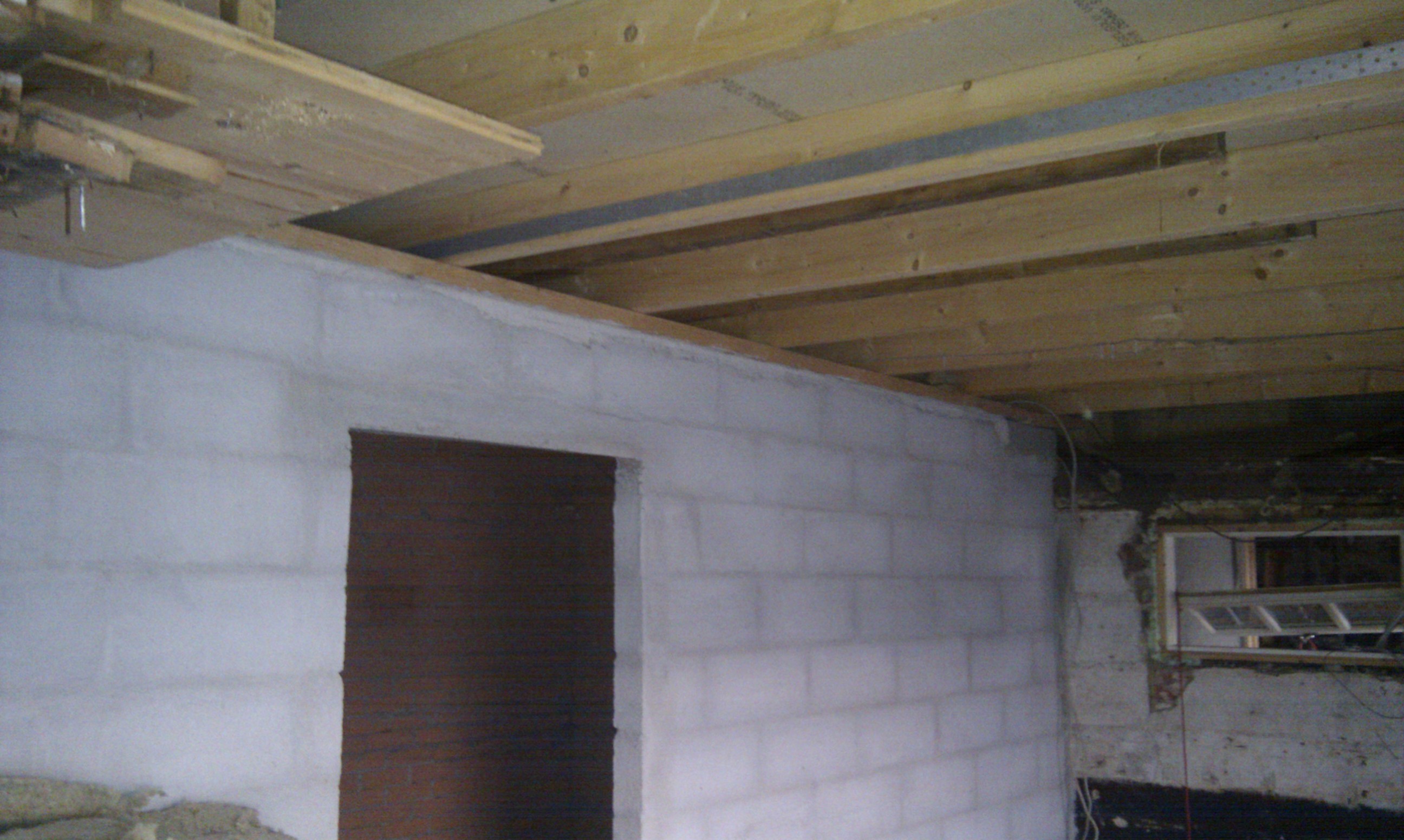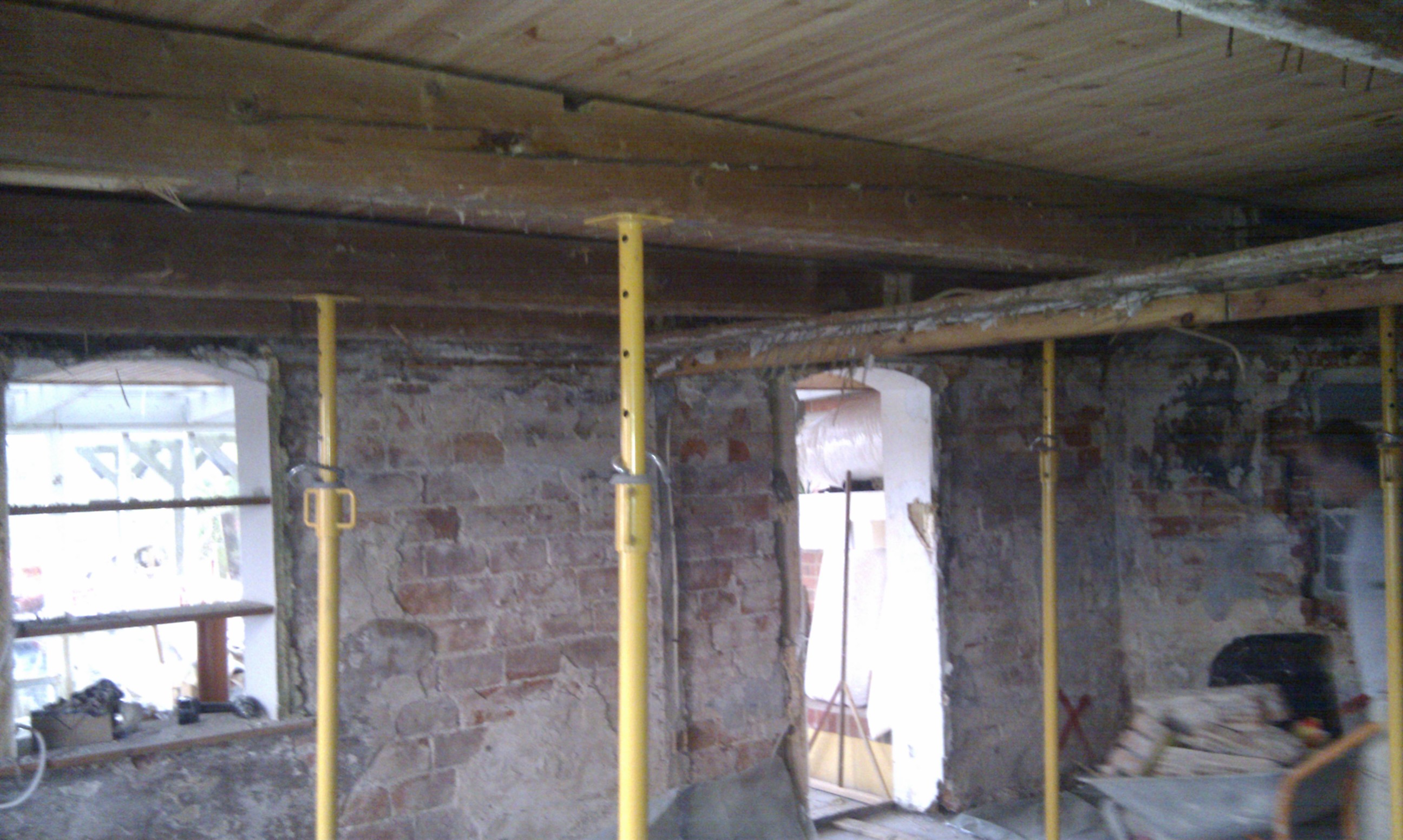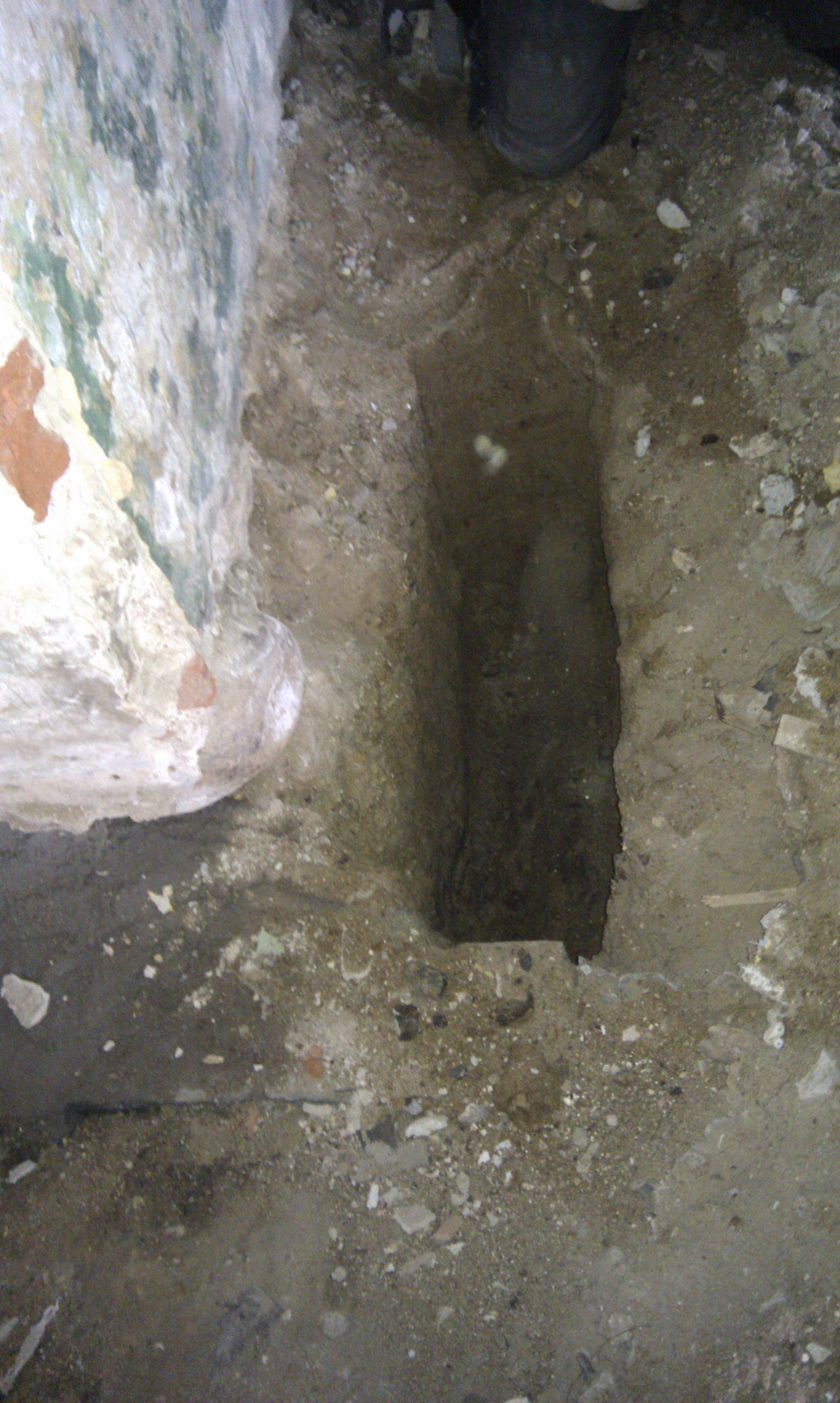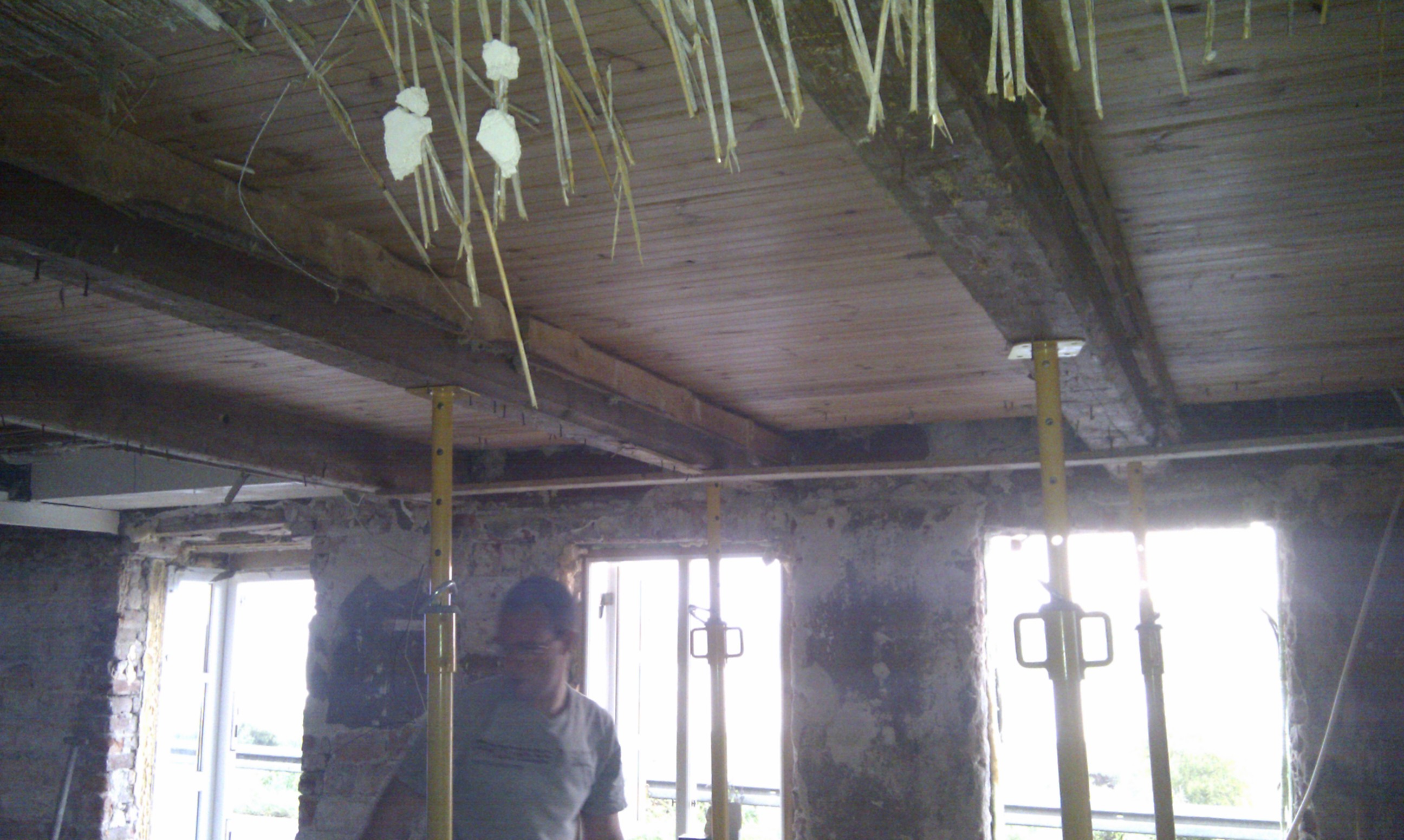 På billedet til højre kan man se markeringen med isolertape hvor vi havde besluttet at ovnen skulle være – og den gamle brændeovn.