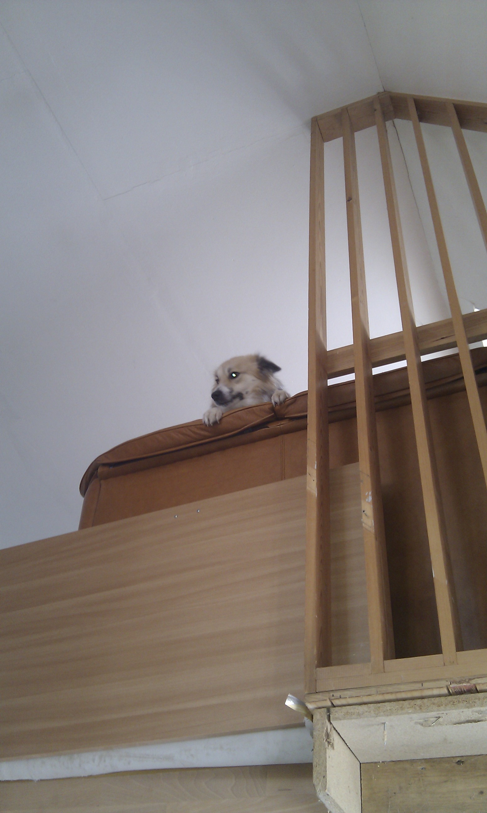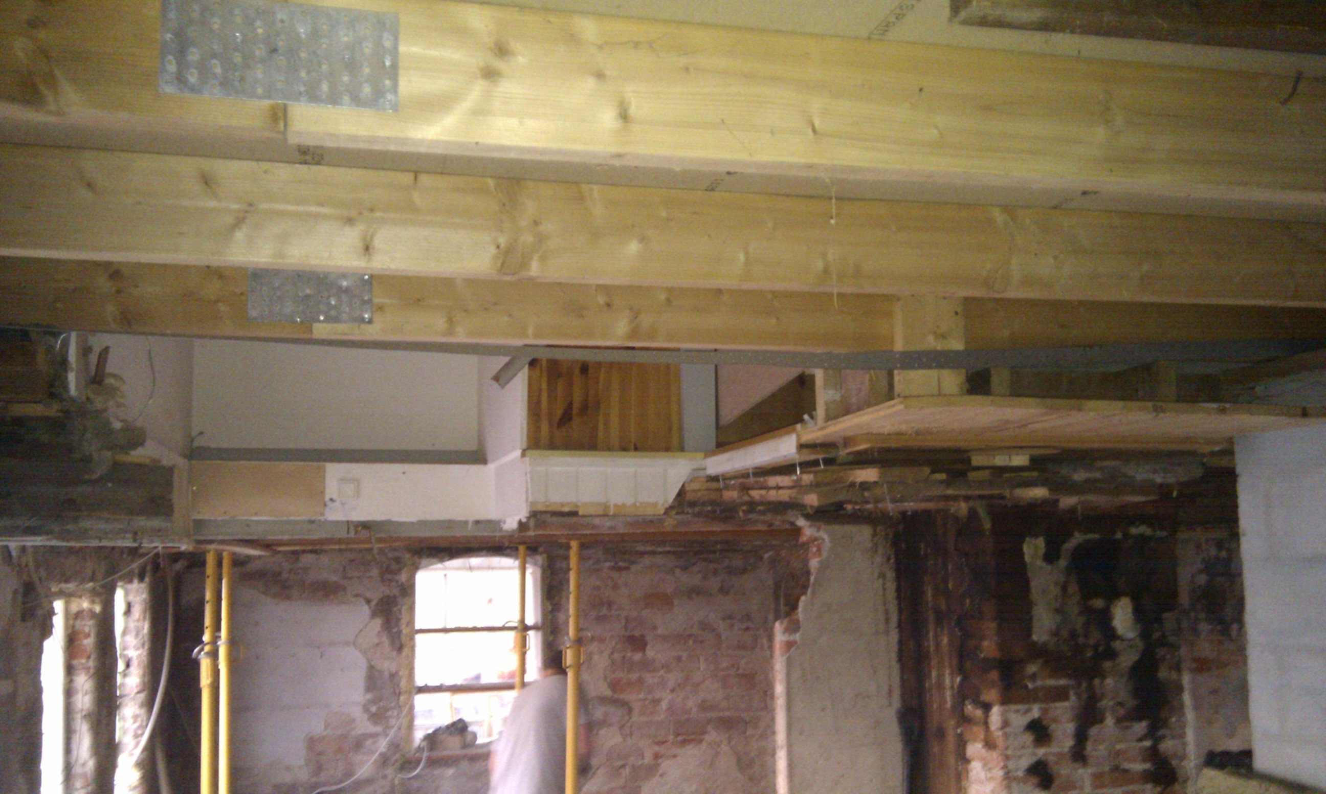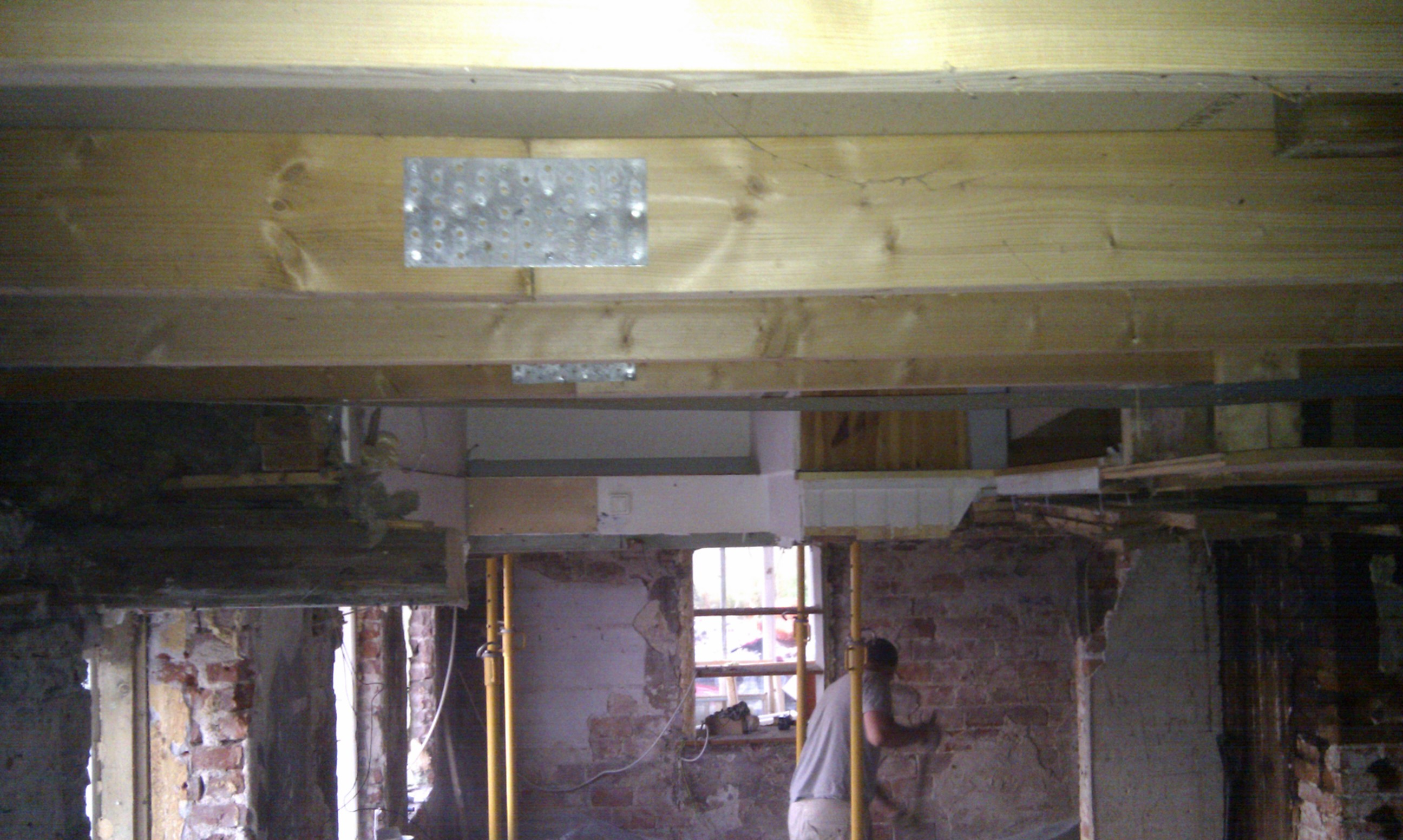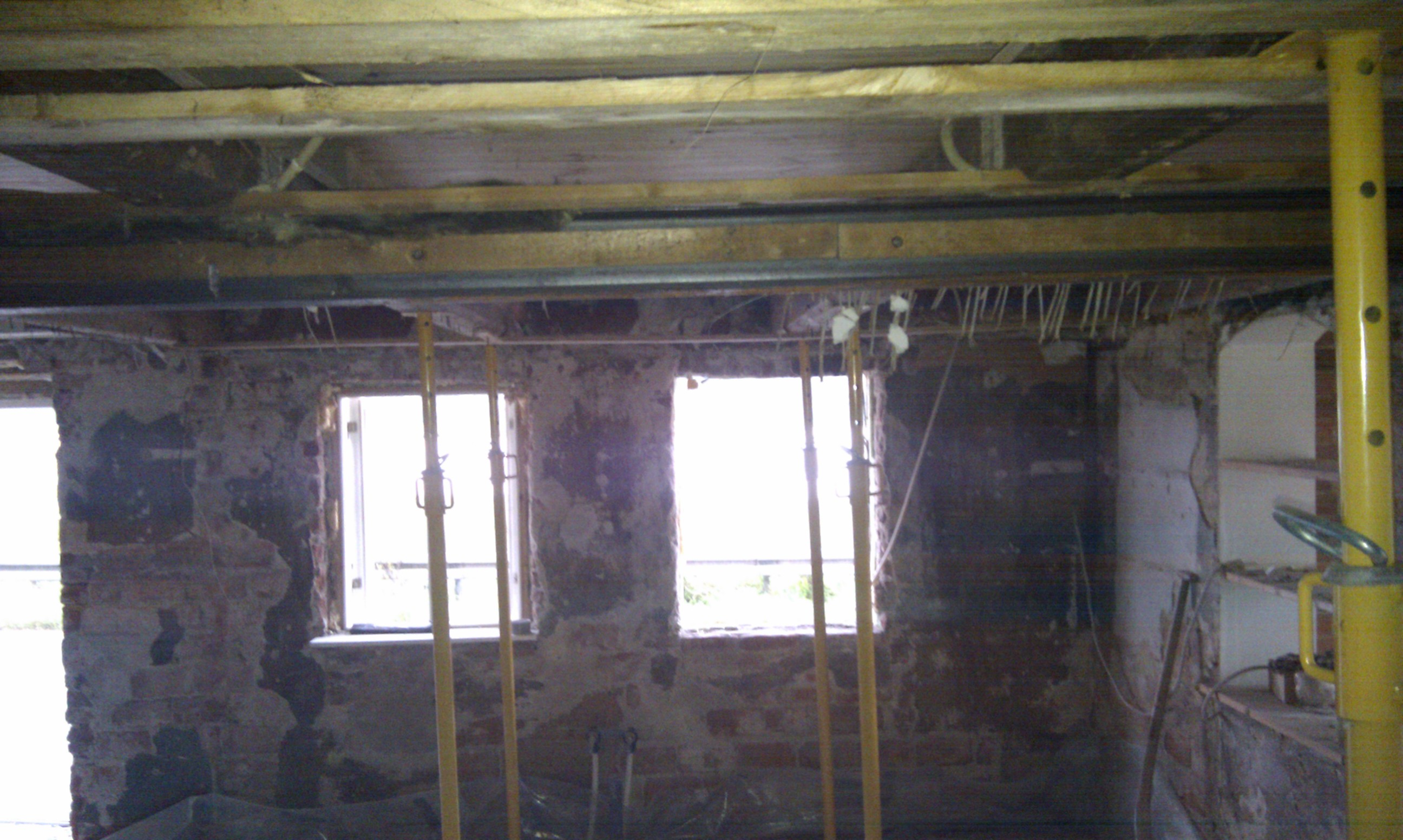 På billedet til højre kan man se markeringen med isolertape hvor vi havde besluttet at ovnen skulle være – og den gamle brændeovn.