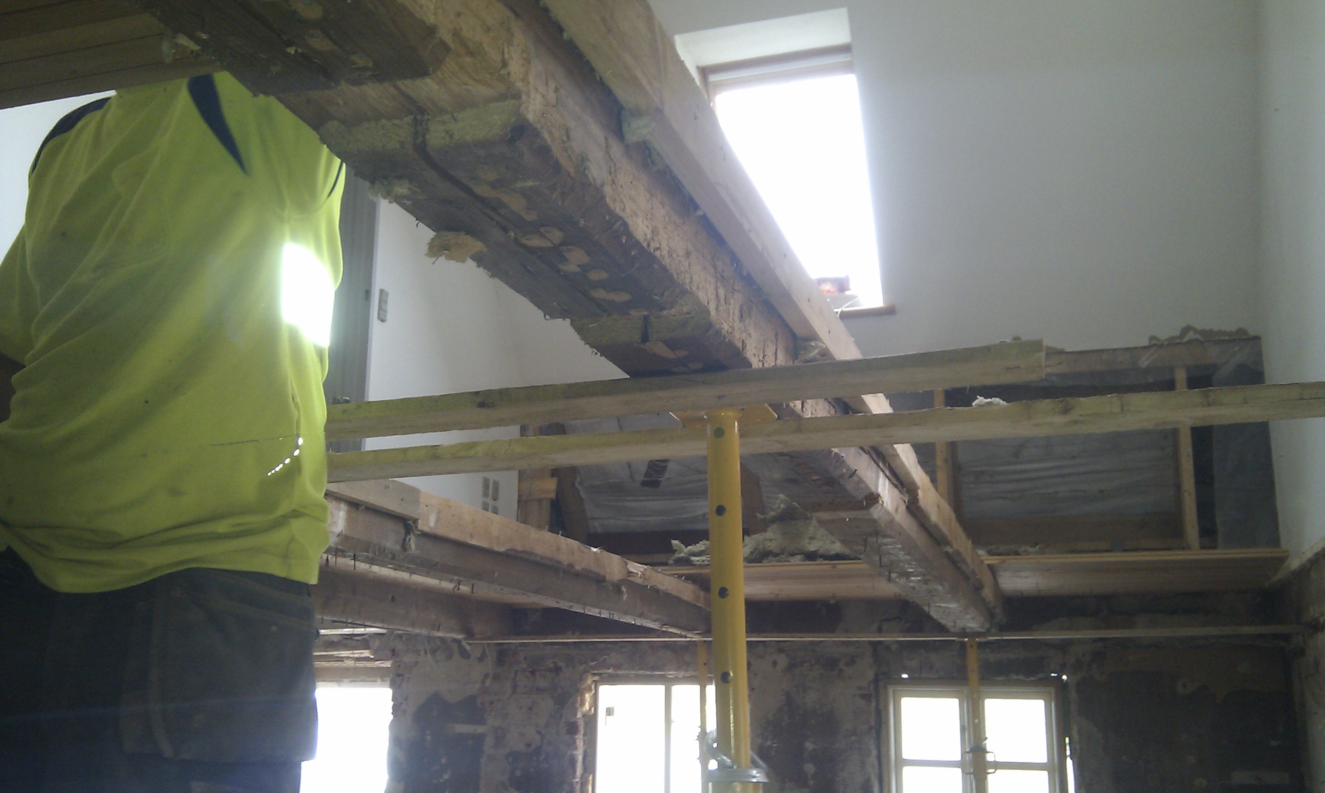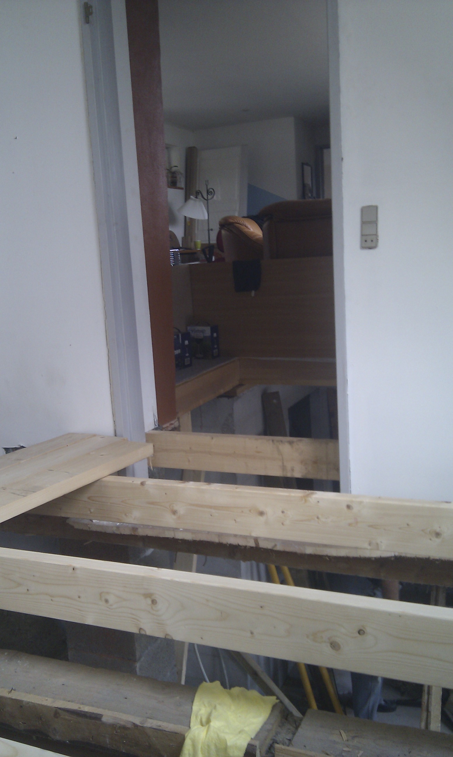 Som det sidste led, i at hæve loftet – har far igennem hele lørdag, kæmpet med at få fjernet de sidste to resterende bjælker. Selvfølgelig med hjælp fra såvel Jan og undertegnede. Det sværeste var i princippet at fjerne de bjælker – da det skal gøres fornuftigt, håndværksmæssigt korrekt og gennemtænkt. Hvilket ikke så godt passer til mig 🙂
