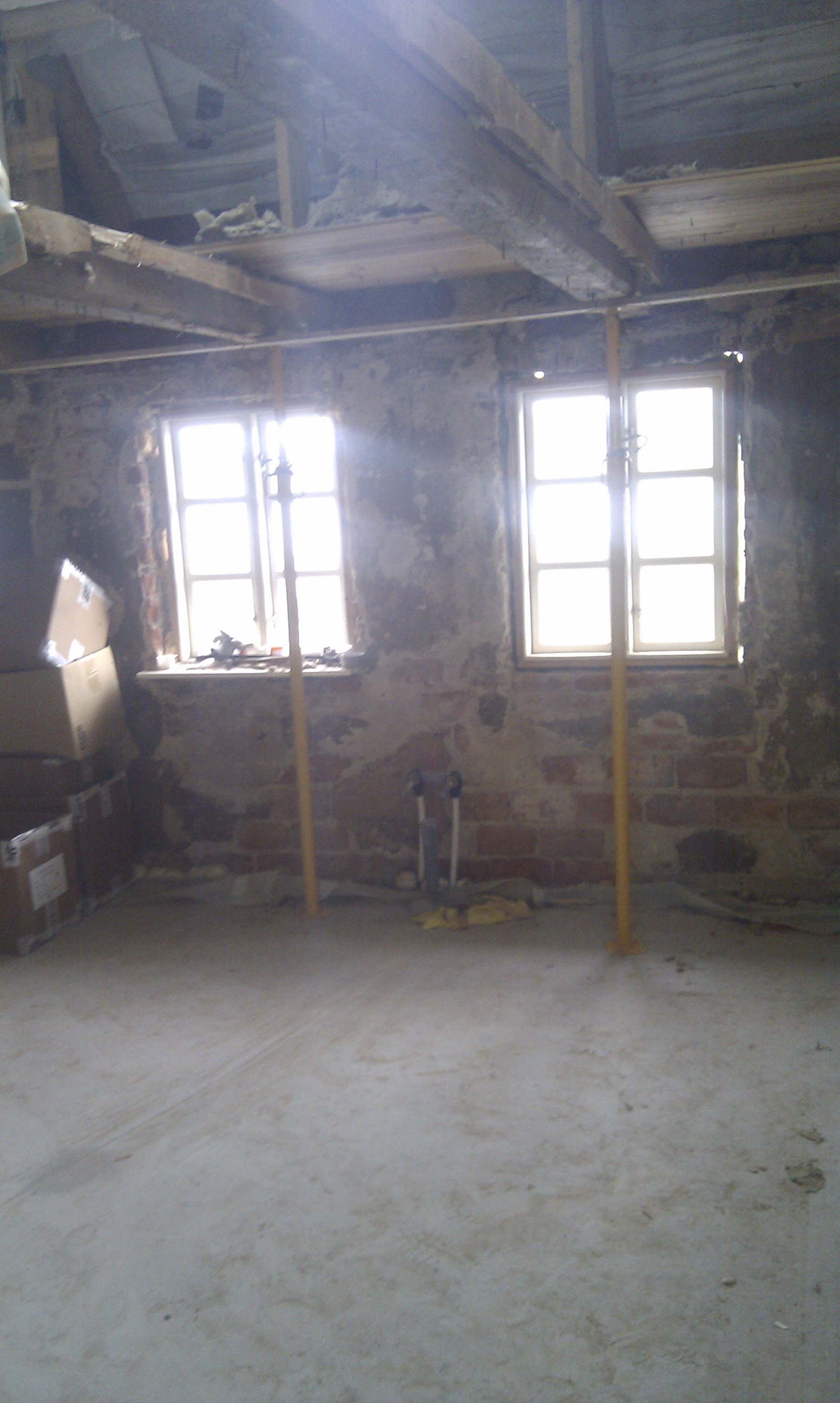Huset er kort sagt skide skævt, det er jo også gammelt, i 1890 tror jeg måske ikke at de målte så nøje som man gør i dag – vinduet i den ene ende af huset sidder noget højere end vinduet i den anden ende af huset.