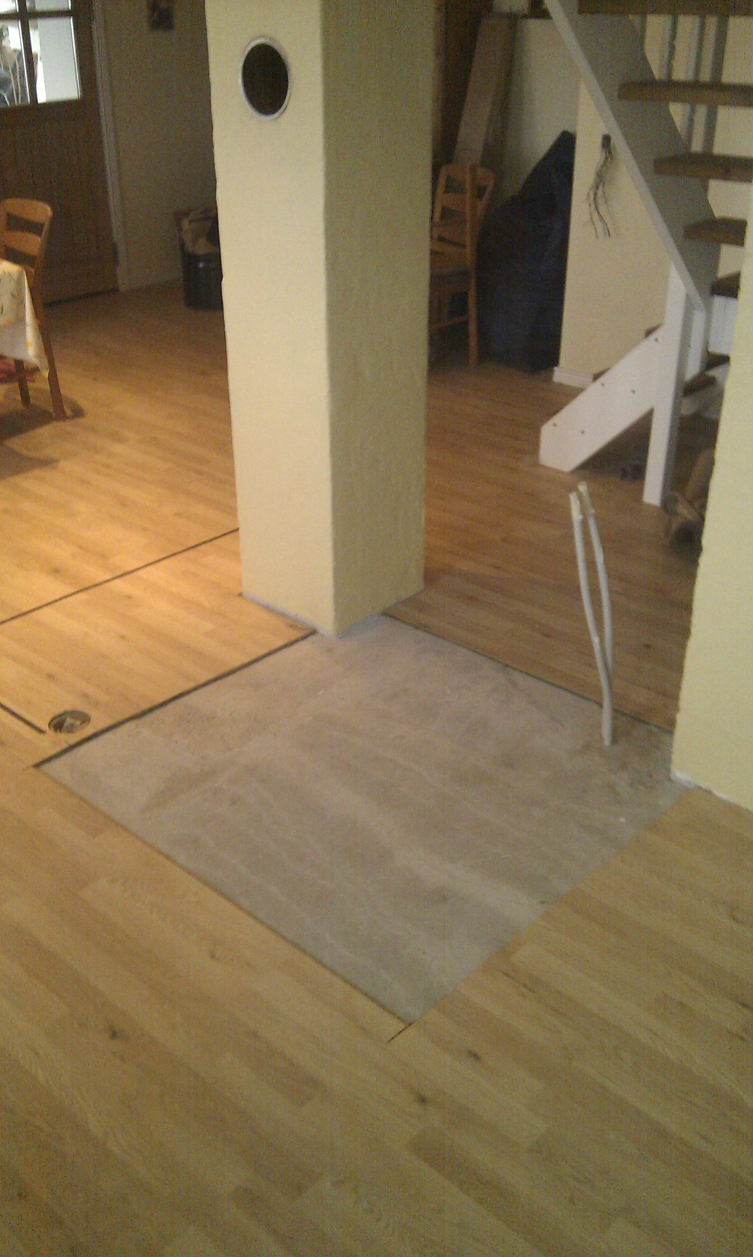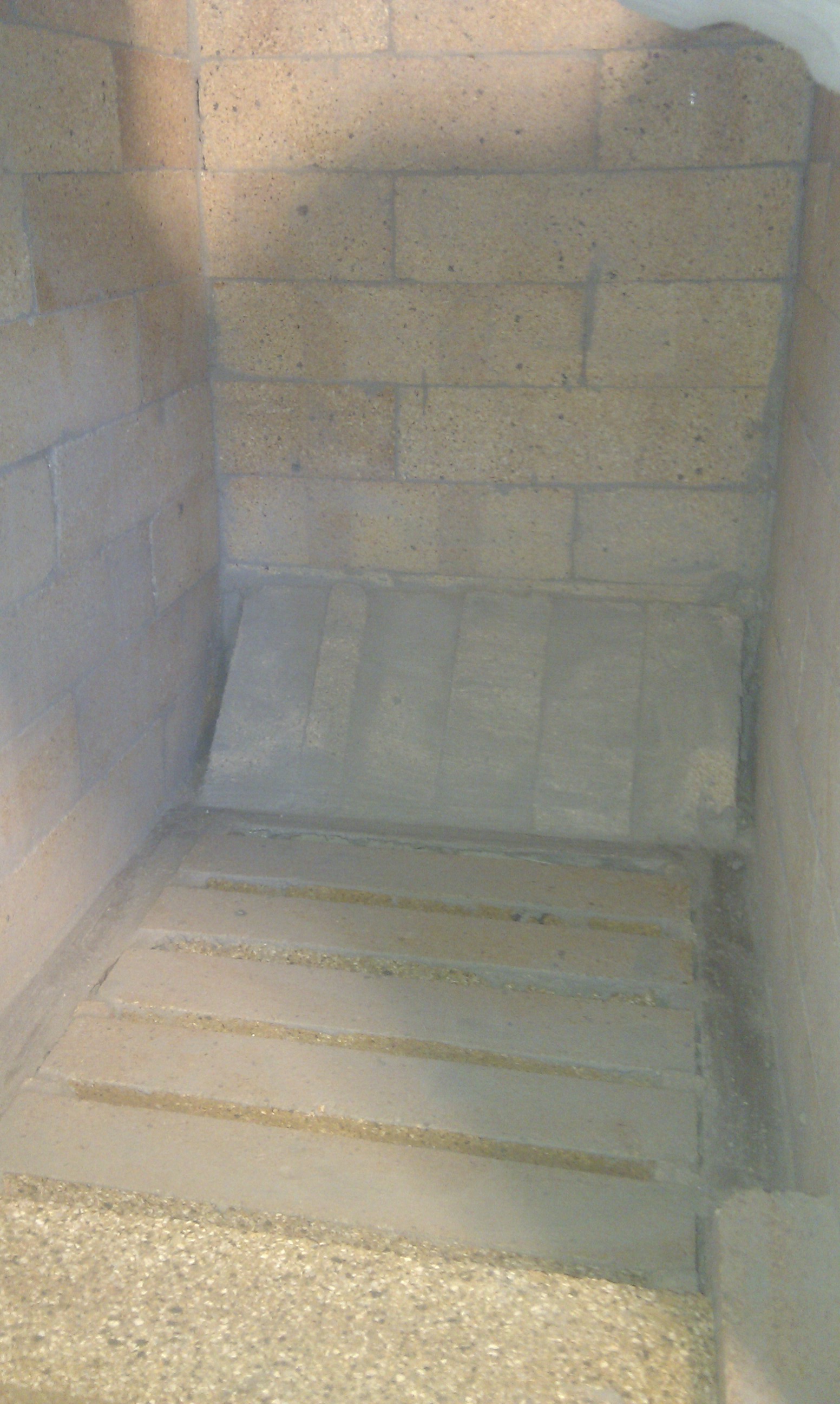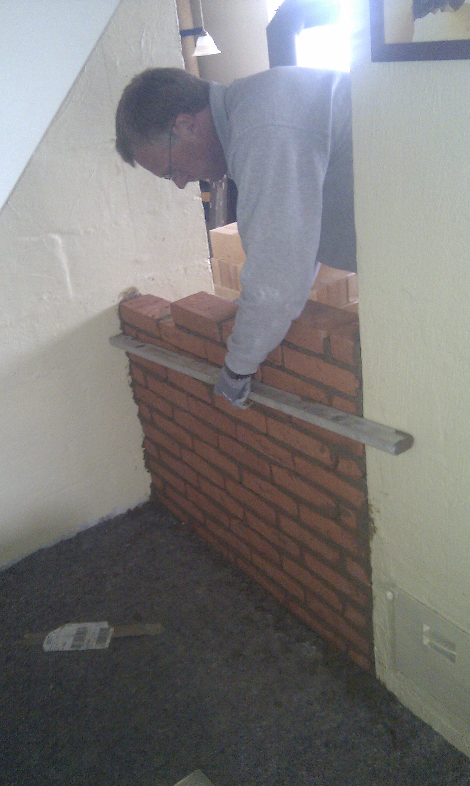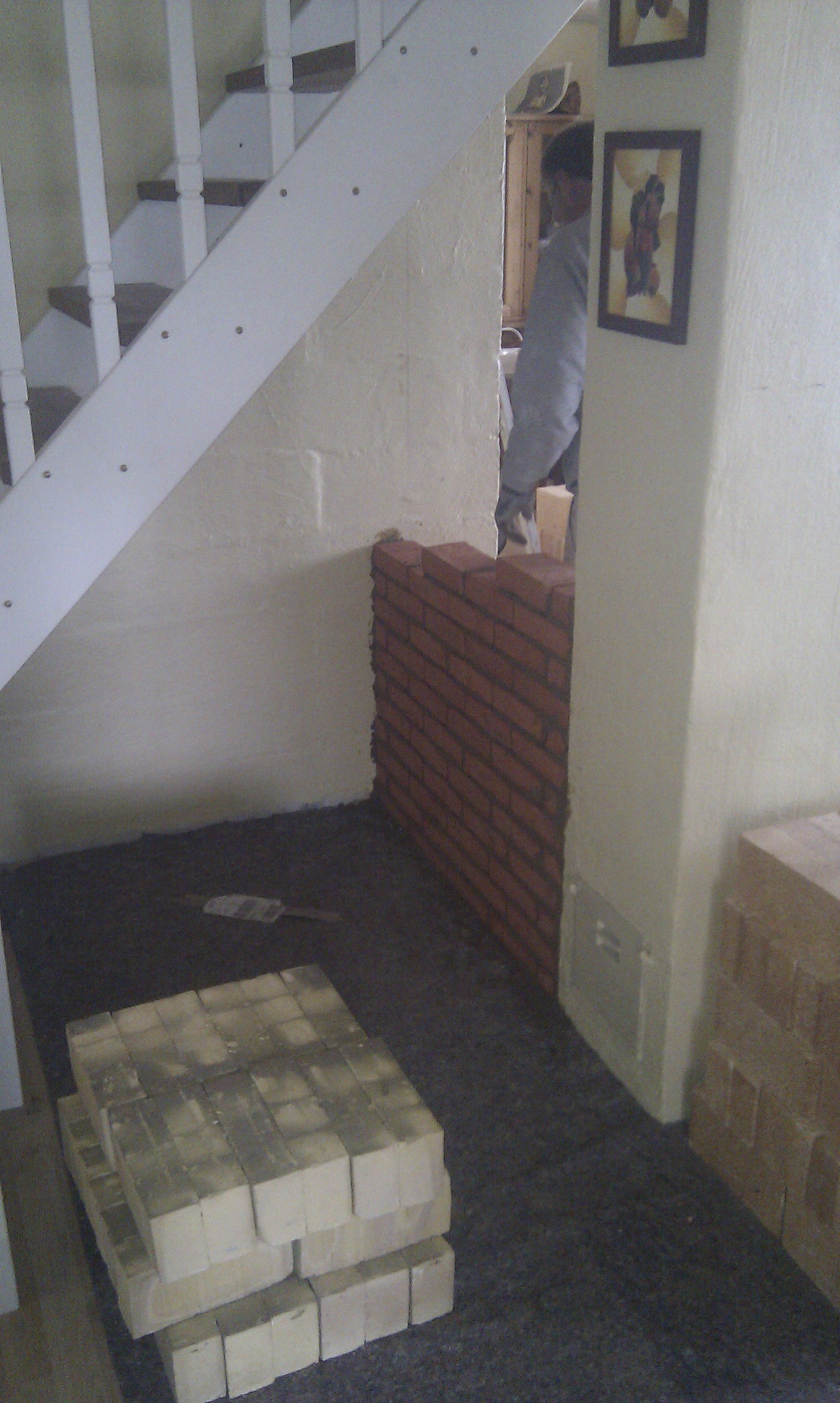 Her kan man bedre se trappen, og hvilken udfordring det ellers ville have været at stå inde under trappen og mure denne væg i fuld højde.