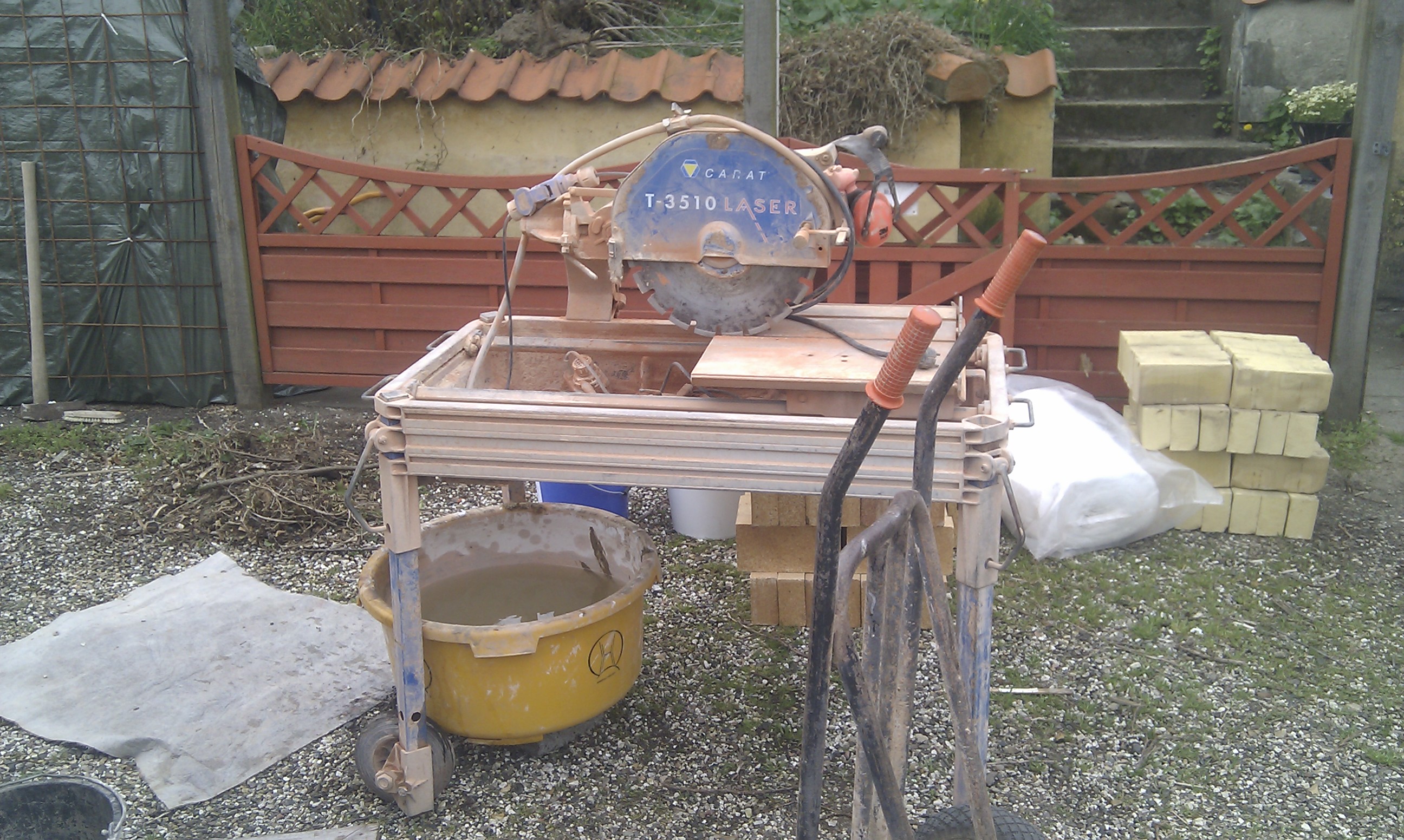 Masseovn manden har sit udstyr i orden, medbringer en diamant skærende rundsav beregnet til at skære sten over, så de enkelte dele tilpasses helt nøjagtigt som vi gerne vil have det.