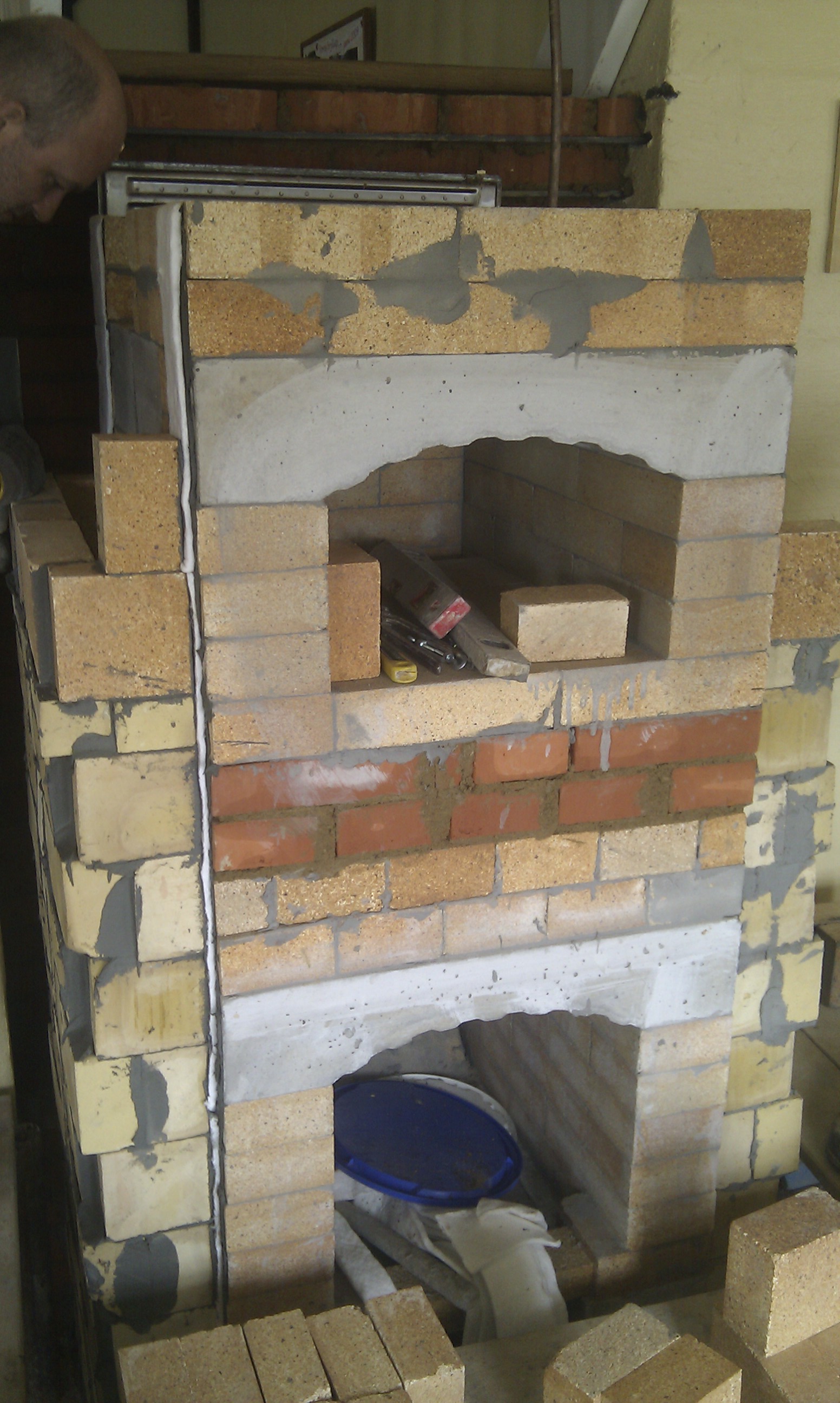 Normalt ville de have sat kernen først og muret yderen af masseovnen efterfølgende, men i dette tilfælde hvor det ikke er en standardiseret løsning, må de starte med at mure bagvæggen op først.