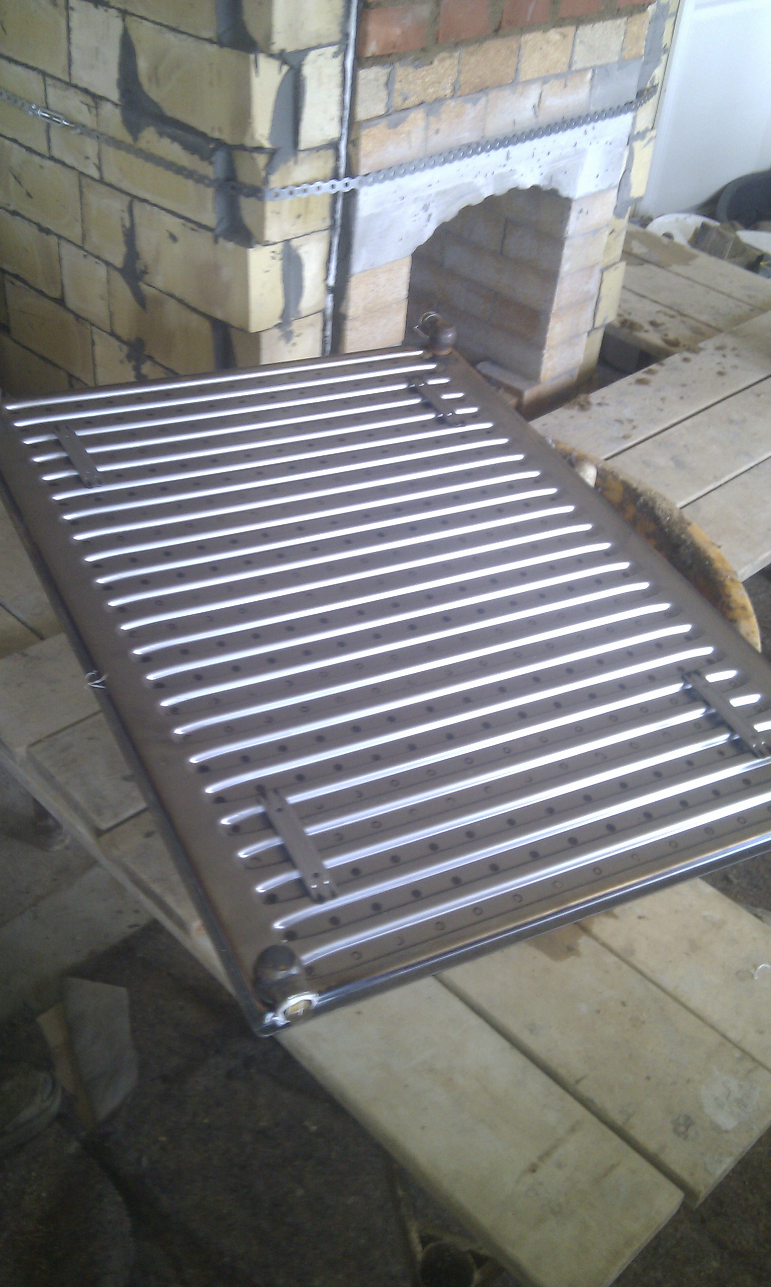 Så er det tid til at ligge top radiatoren ovenpå masseovnen. Denne radiator er den af de to radiatorer der optager mest varme, men der dog koblet sammen med den anden radiator også, for at give mere overflade til at optage varmen..