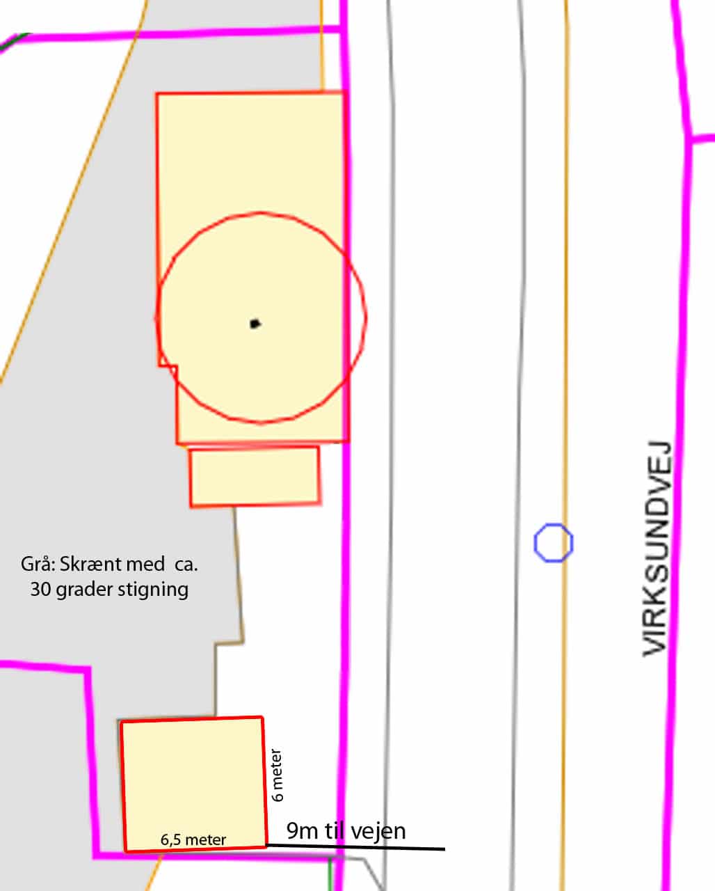 Det hus bliver 6m x 6.5m hvis min planlægning holder, hvilket gør – at jeg maksimalt kan bygge den 9m fra vejen – derfor skal der søges en undtagelse.