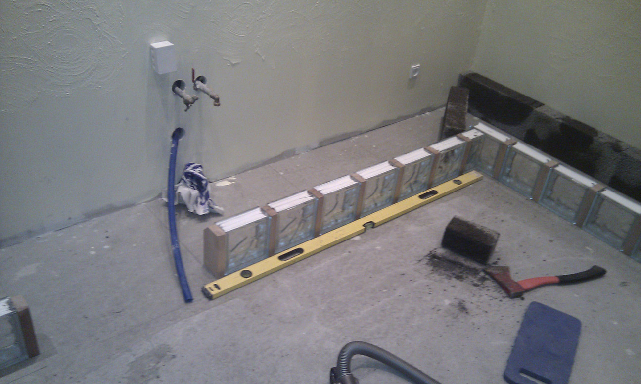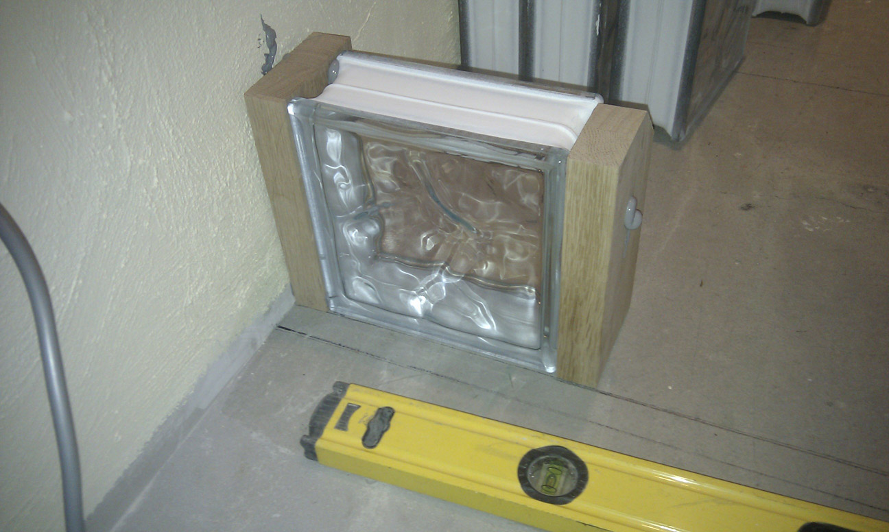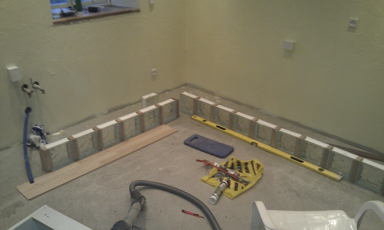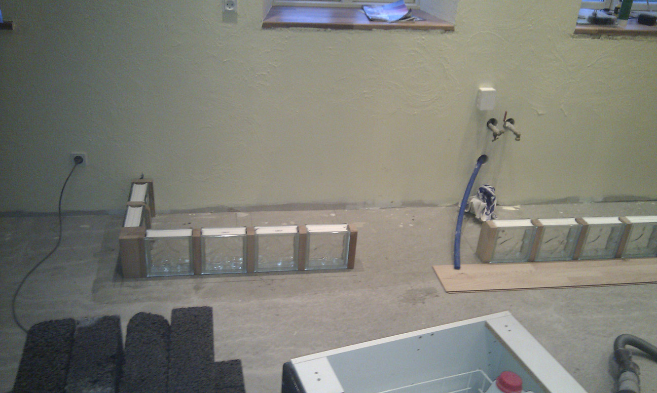 Den inderste del af soklen, ind mod væggen – er lavet af leca sten – de har samme højde som glasbyggesten – og giver derfor intet problem med at få tingene til at stå lige.