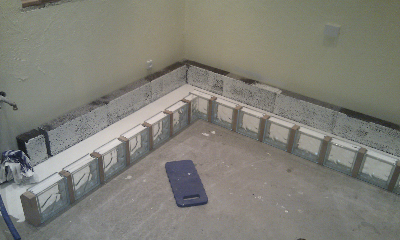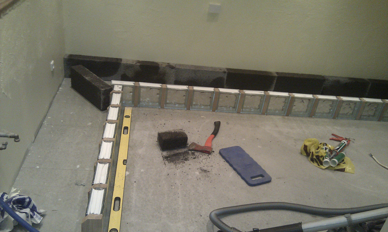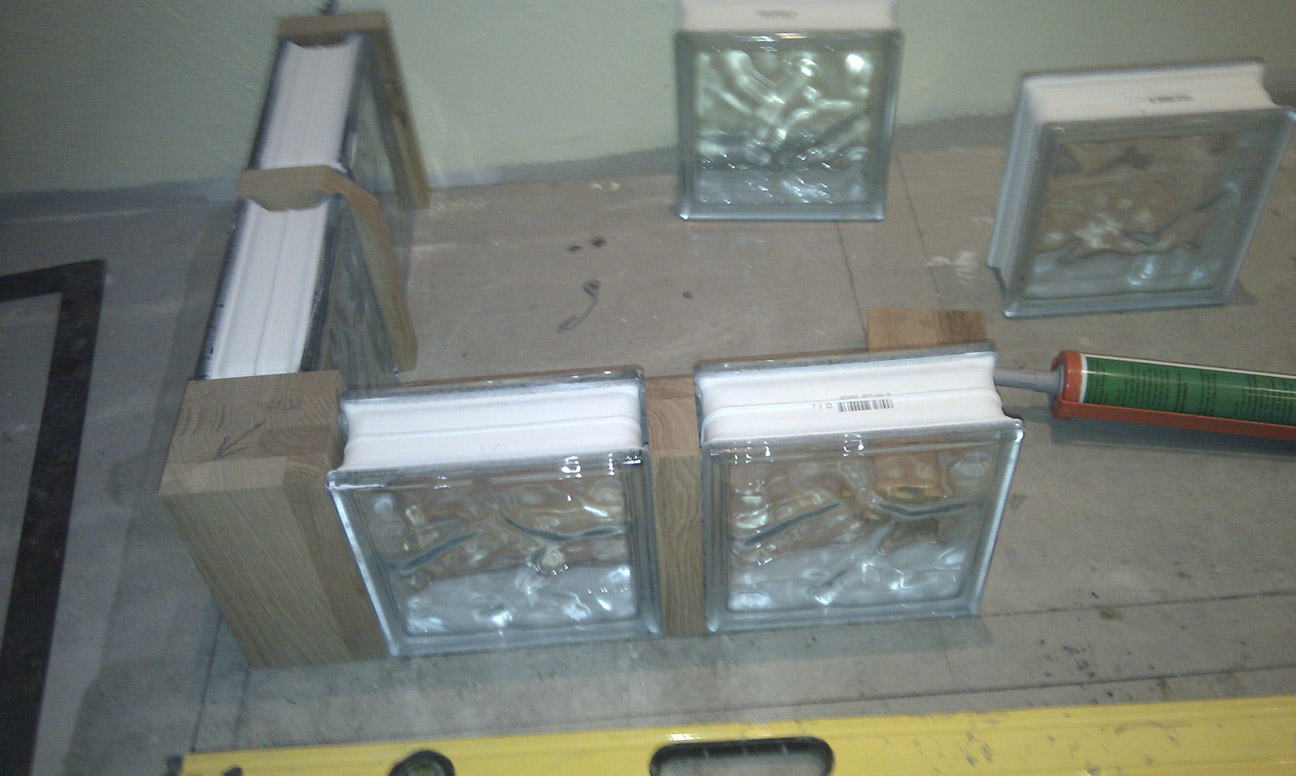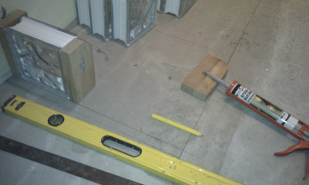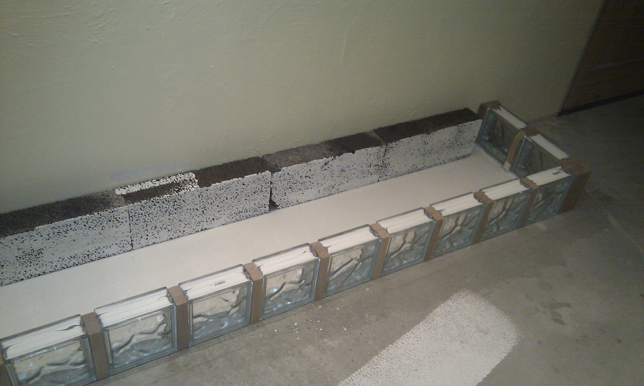 Den inderste del af soklen, ind mod væggen – er lavet af leca sten – de har samme højde som glasbyggesten – og giver derfor intet problem med at få tingene til at stå lige.