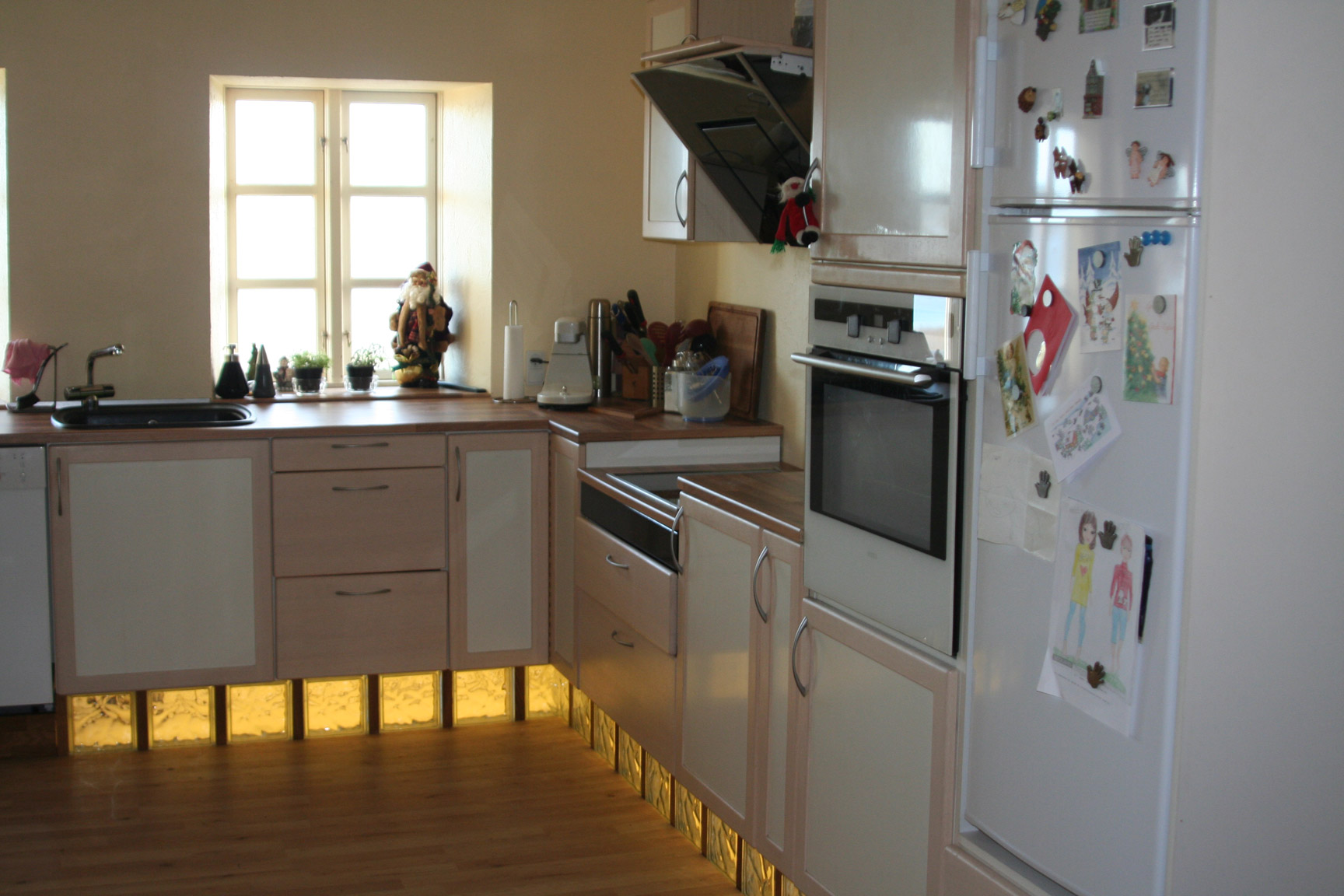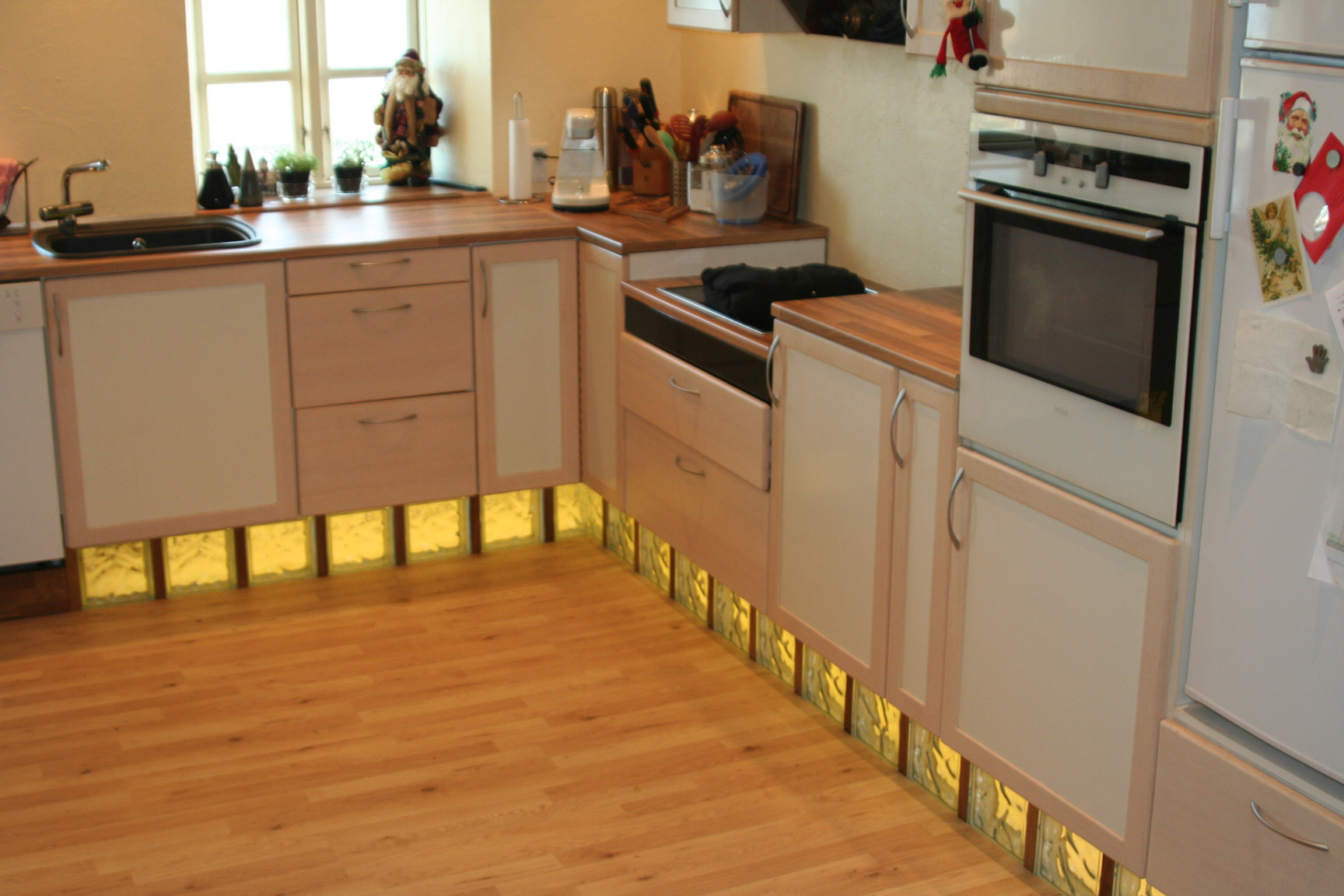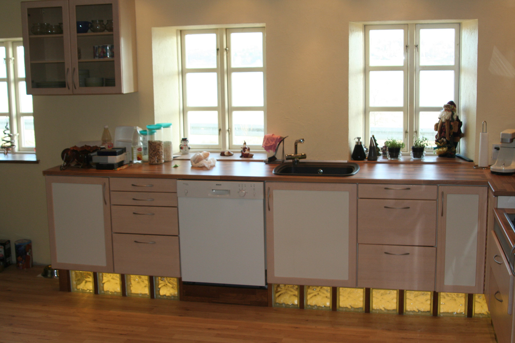 Jeg lavede en tidligere tråd her på VoresByg.dk med kaldet Glasbyggesten som sokkel i køkken – med lys i. Men der er gået nogle måneder fra ideen først begyndte at spille til jeg endelig fik det til at blive til noget.