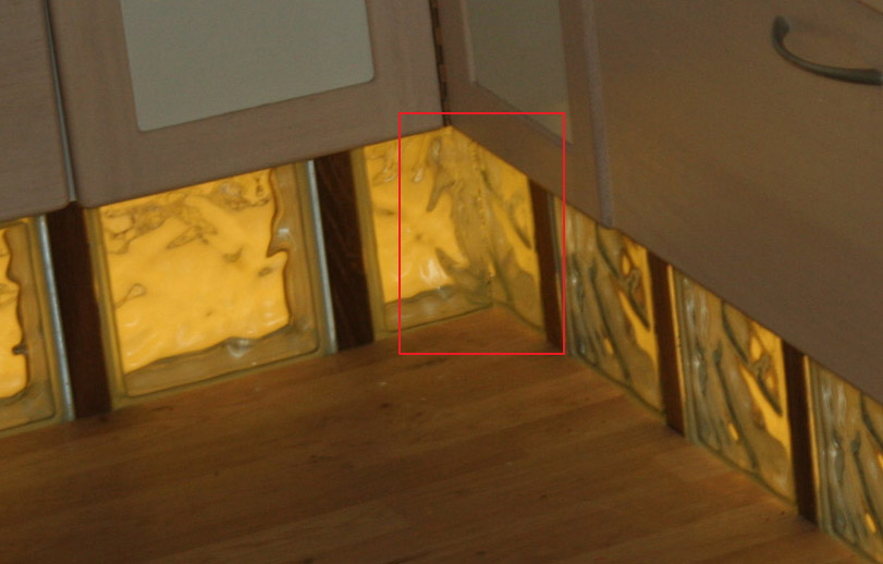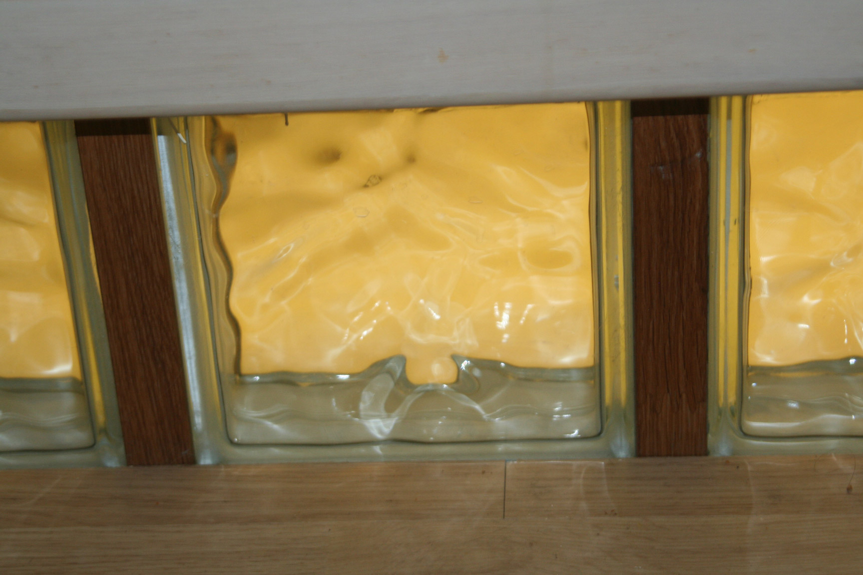 Der er savet et hjørne af de smalle træklodser mellem glasbyggesten – fordi LED båndet bliver klistret direkte på glasbyggestenene – det forlænger levetiden på LED bånd fordi de kan komme af med den smule varme de producerer.