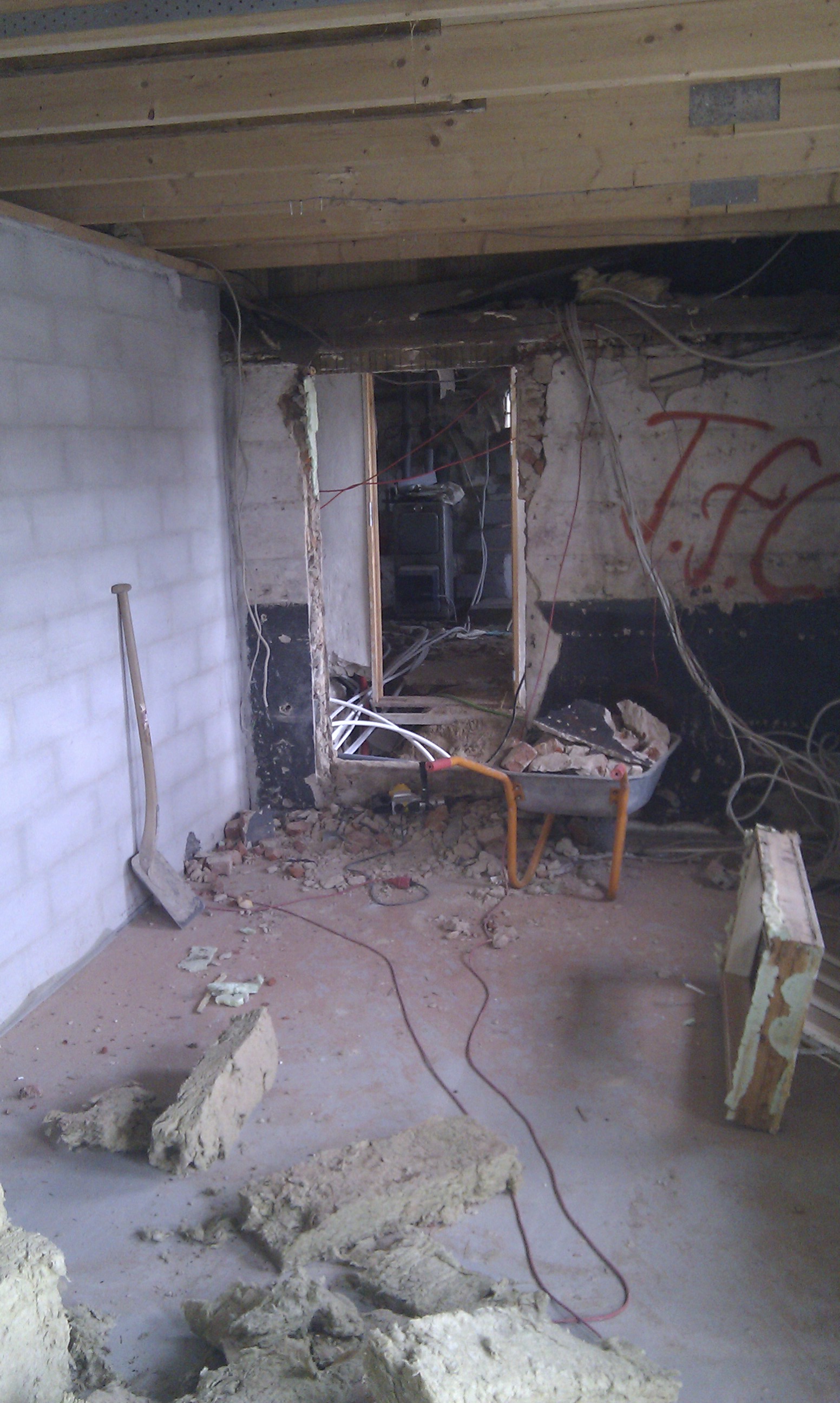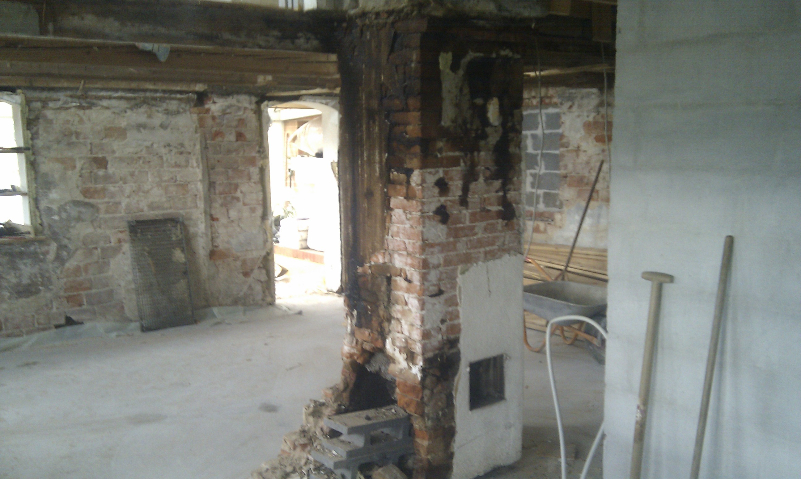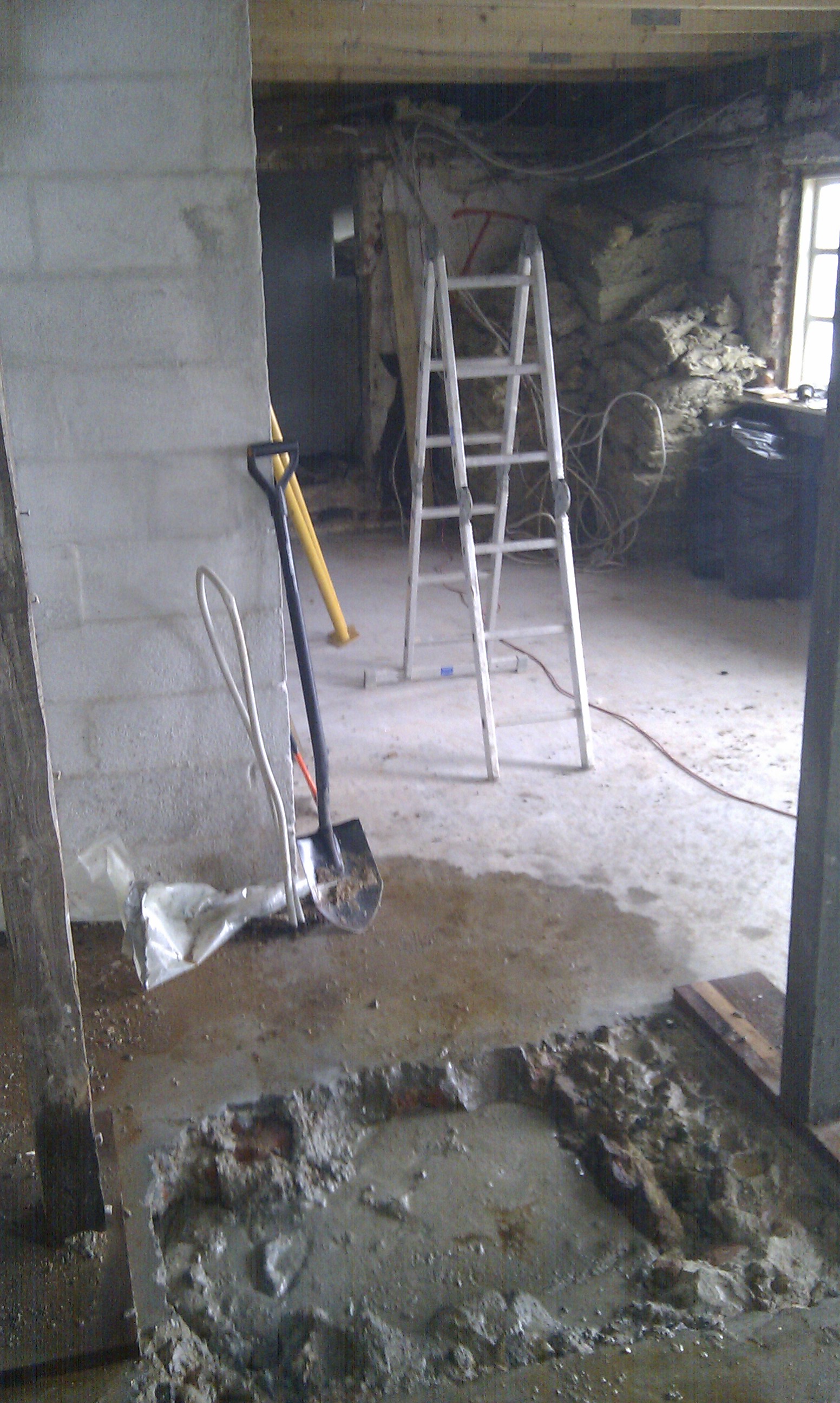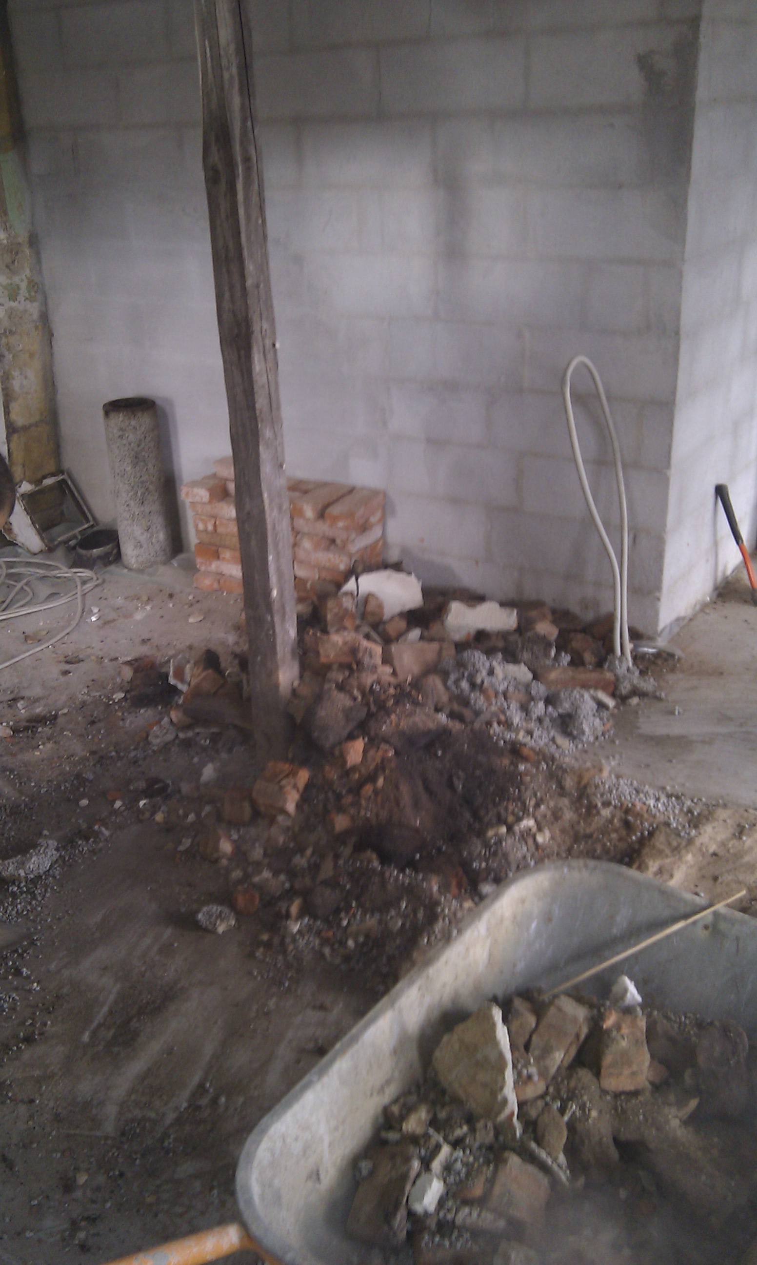 Som det kan ses på billedet, er gulvet skåret ud, og det er klart til at mure kerne og bagvæg op til masseovnen.