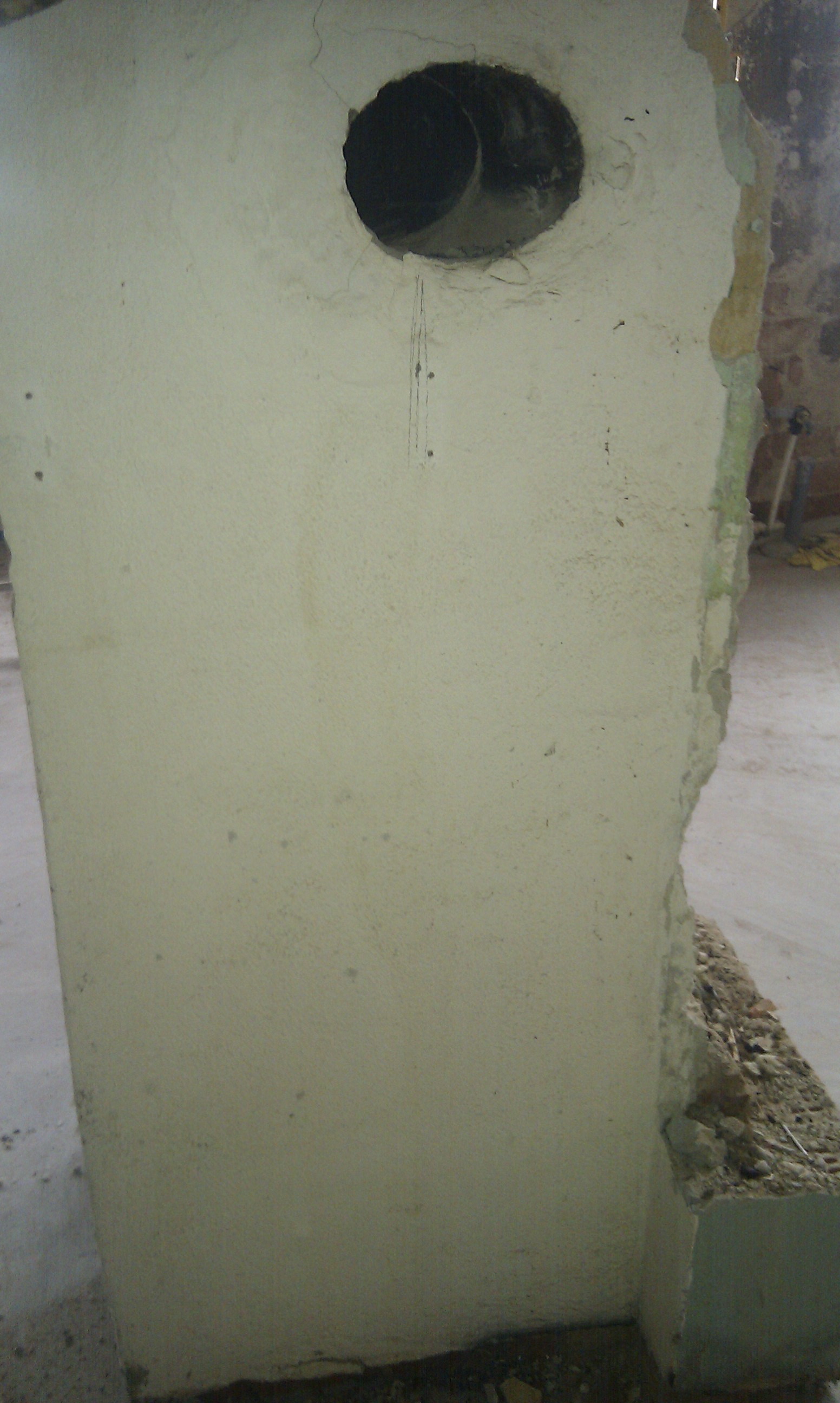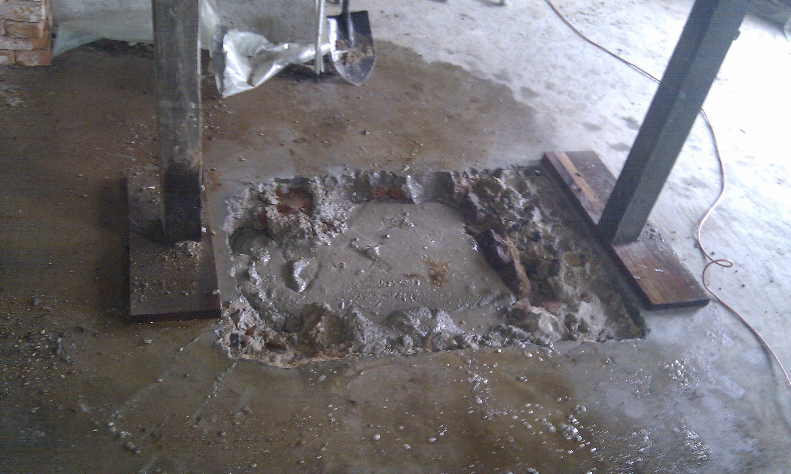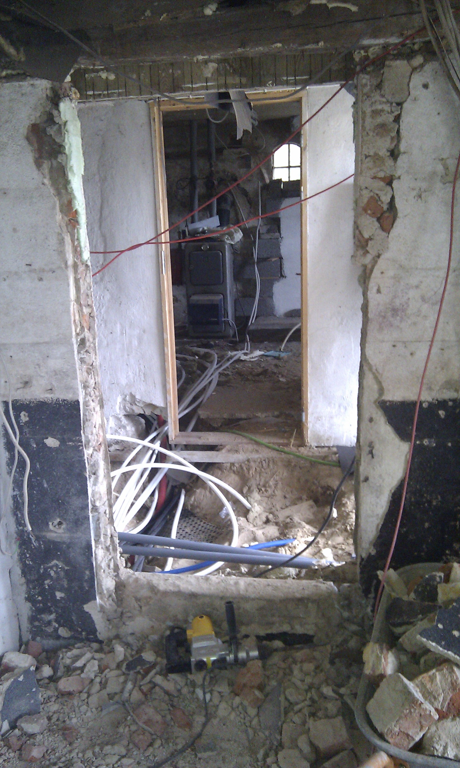 Som det kan ses på billedet, er gulvet skåret ud, og det er klart til at mure kerne og bagvæg op til masseovnen.