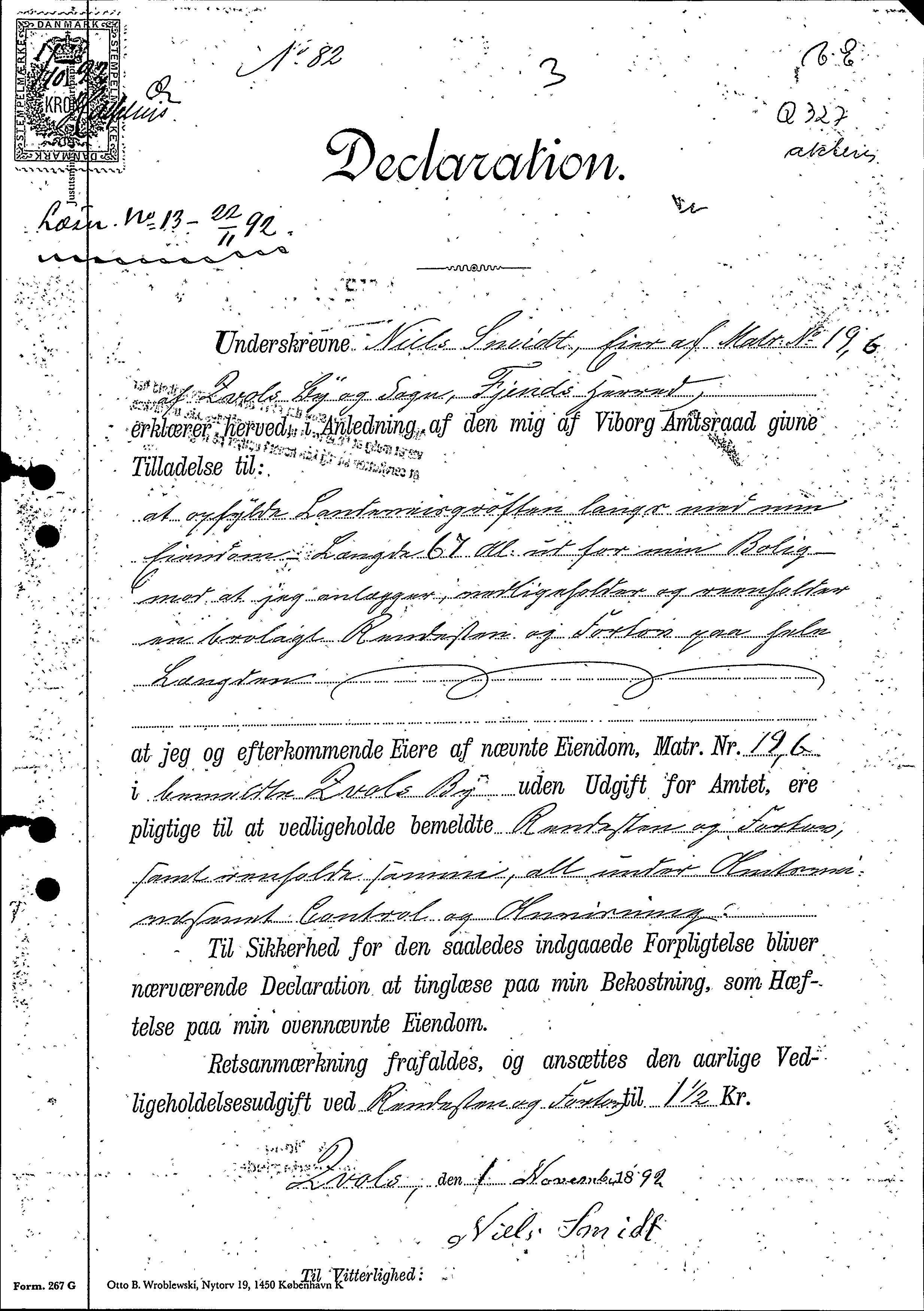 Underskrevne Niels Smidt, ejer af matr. no. 19b af Kvols by og Sogn, Fjends Hjerred erklærer herverd i Anledning af den mig af Viborg Amtsraad givne Tilladelse til: at opføre…